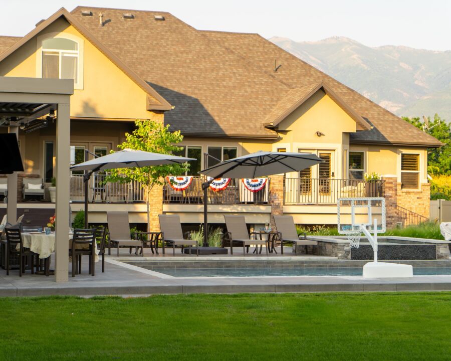 This outdoor Utah retreat perfectly balances luxury, design, and natural beauty, creating a haven for unforgettable memories. A large, shimmering pool lies at its center, reflecting the vast Utah skies. Beside the pool, a striking fire feature creates a warm, inviting space for evening gatherings. A grand pergola stands nearby, providing a shaded area for relaxation or entertaining. The fully equipped and seamlessly integrated outdoor kitchen invites culinary adventures in the fresh air. Lush landscaping ties it all together with vibrant greenery, colorful flowers, and winding pathways.