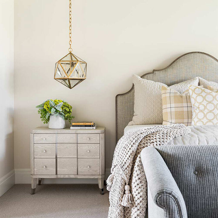 When the family who owns this Transitional slice of serenity first came to Open Range, they were looking for help creating a calming escape from the hustle and bustle of their day-to-day. Our design combines a mix of blues, greys, and taupes with striking brass touches and artwork selections that are no yawn.