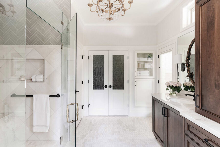The master bathroom is one of our favorite spots to invest in a few eye-catching details that scream upscale and classic. In this classic bathroom remodel, we were able to achieve that feel with an airy chandelier, a bronze mirror detail and our favorite - his and her washrooms for the ultimate in chic privacy.