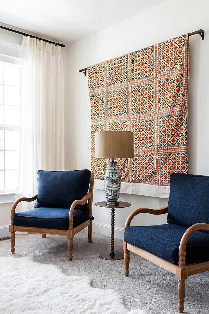 We gave this Spanish Colonial in Federal Heights a traditional facelift that felt authentic to the original home, with an upscale, modern-day touch. One of our favorite tools in that transformation - several tapestries in the wrought-iron stairway that play off of the traditional stair runner and wooden ceiling vaulting in the front foyer. The vibrant patterns woven throughout the project are the icing on the cherry.