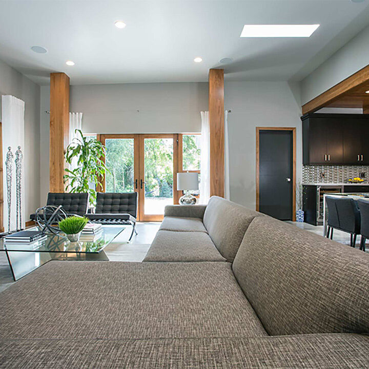 The best modern interior designs strike the right balance of creating an inviting space, while still observing clean lines and minimalist styling characteristic of the look. So when our residential team began work on this Holladay home, we wanted to identify those staples and elevate them. We achieved that by highlighting architectural wood beams, which make several surprising appearances throughout the house, lighting, and other natural elements to reflect the home's majestic surroundings.