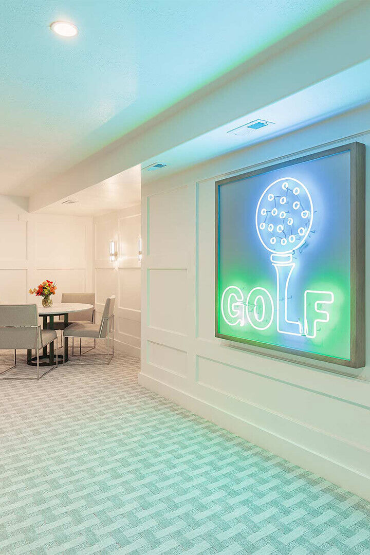 Looking to take your golf game to the next level? This basement allows its homeowners to practice their swing without leaving the house. Our residential team had fun reimagining this basement in an aesthetically pleasing way that's also functional. Lighting played a huge role in our design with a custom neon sign and uplighting that sets off bar seating.