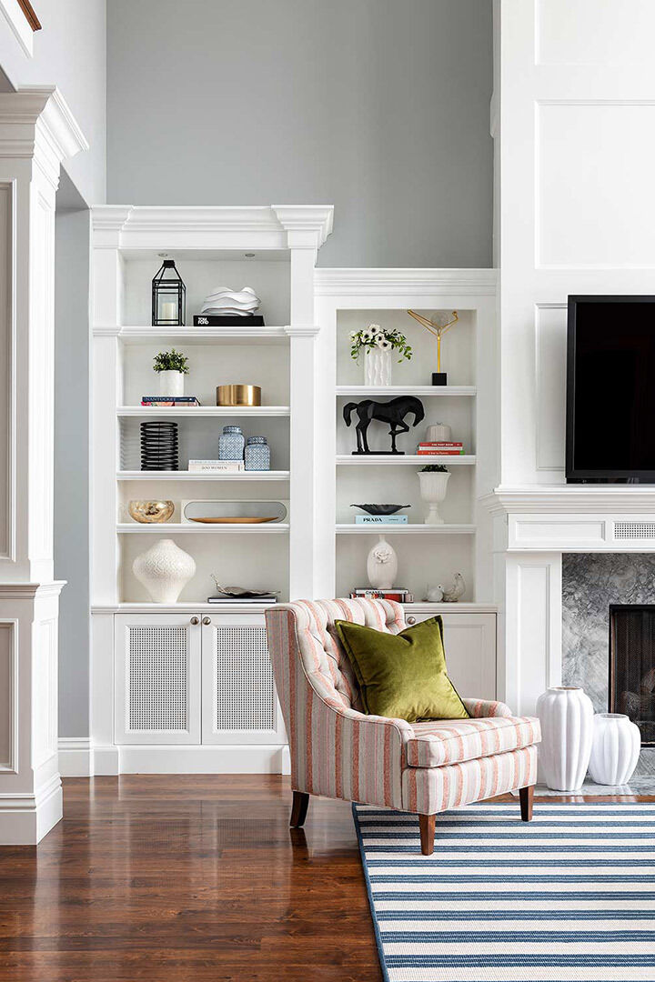 Ornate, extravagant, and the right balance of opulence and functionality - that's what the Glam interior design style is all about. So when this Morgan family asked for our help achieving that look, we pulled out all the stops with bright carpets, striking blue build-in cabinets, graphic window treatments, and a floral wallpaper for the powder room that screams joy, joy, joy!