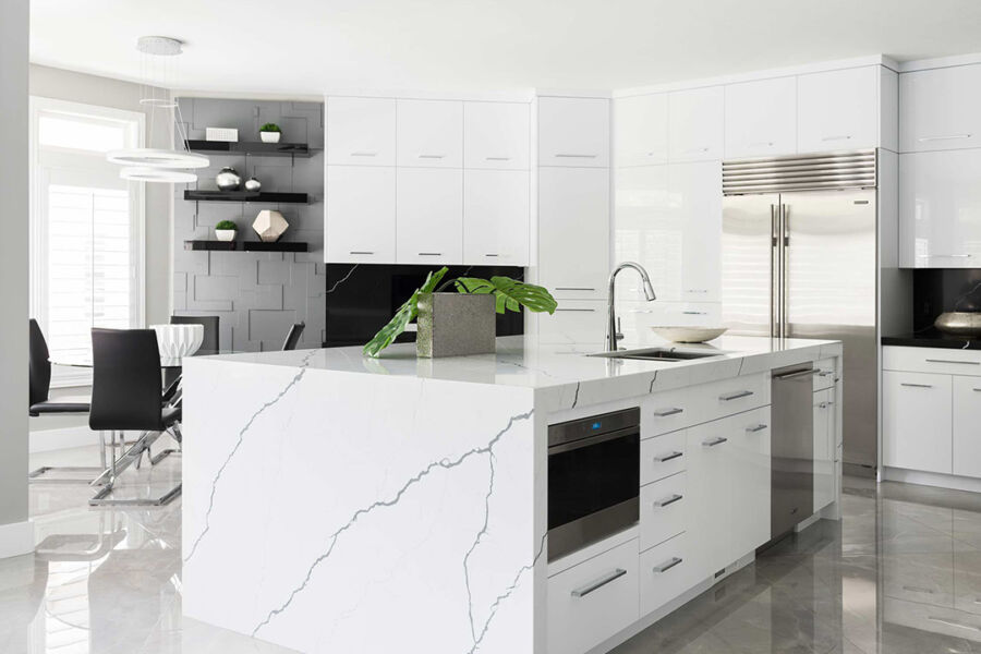 Going from Tuscan styling to Ultra-Modern is no small feat! It requires a creative eye to reimagine the space and a clear vision to bring it all together. That's what our residential team was able to do on this Holladay, Utah stunner. The key to our transformation: opening up the floor plan by taking down several non-weight bearing walls and moving the color palette away from wooden floors and paneled walls to sleek, large-format porcelain tiles and white walls. It can be a tightrope, mixing the clients' wants with the original architecture of the home. Still, the transformation in the kitchen, with the waterfall feature on the island and textured wall detailing, truly highlights how a clear vision and focus can carry the day.