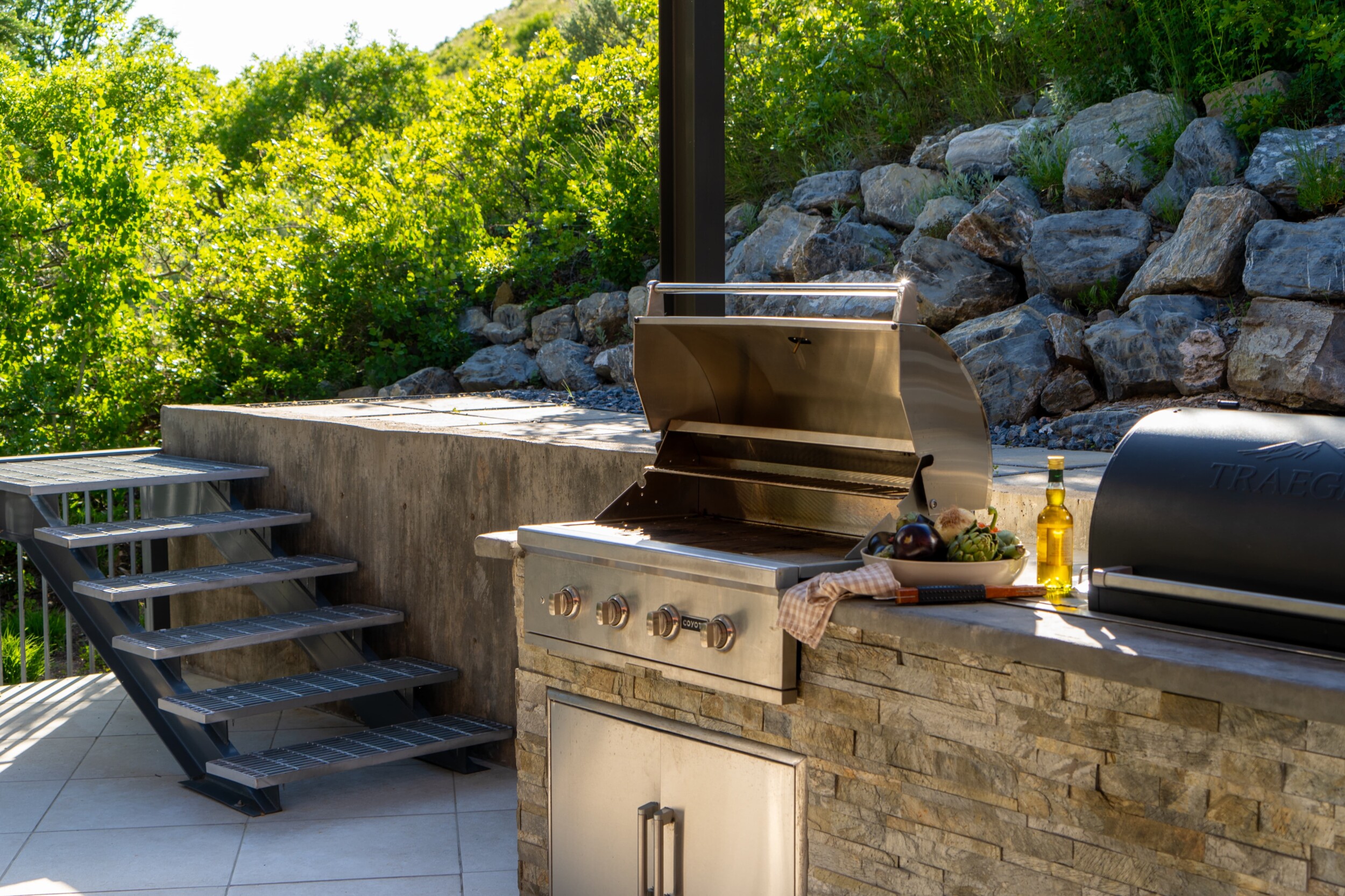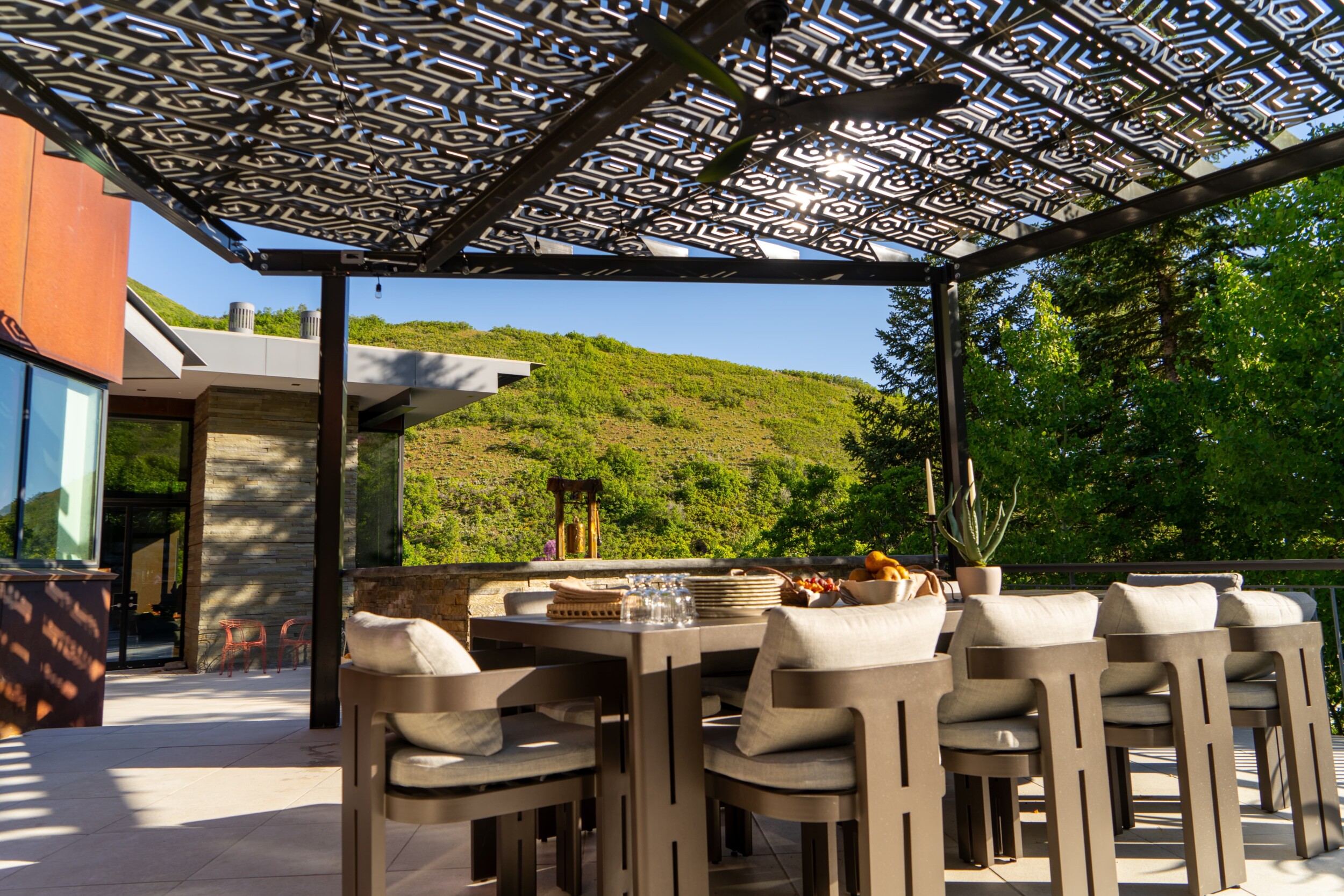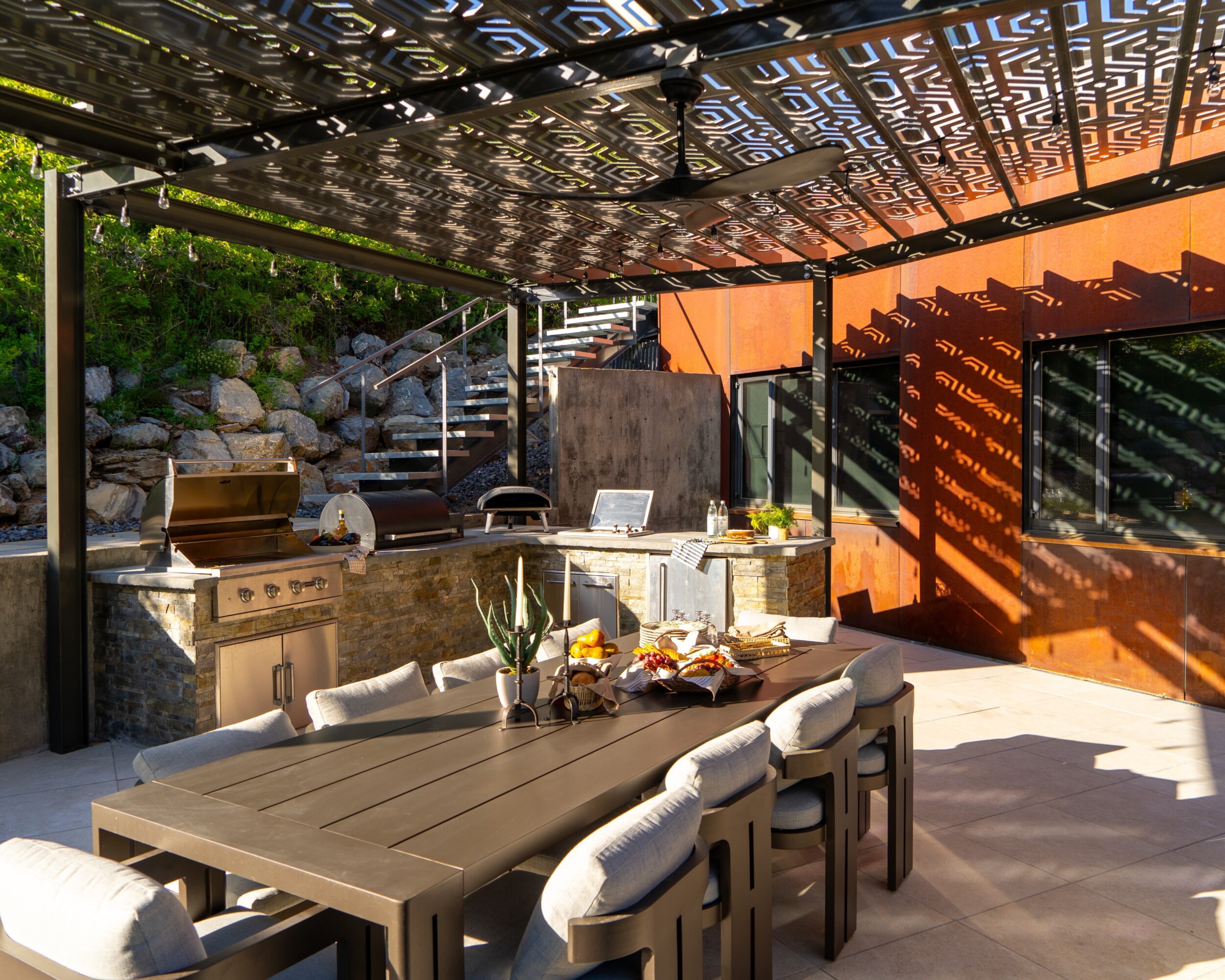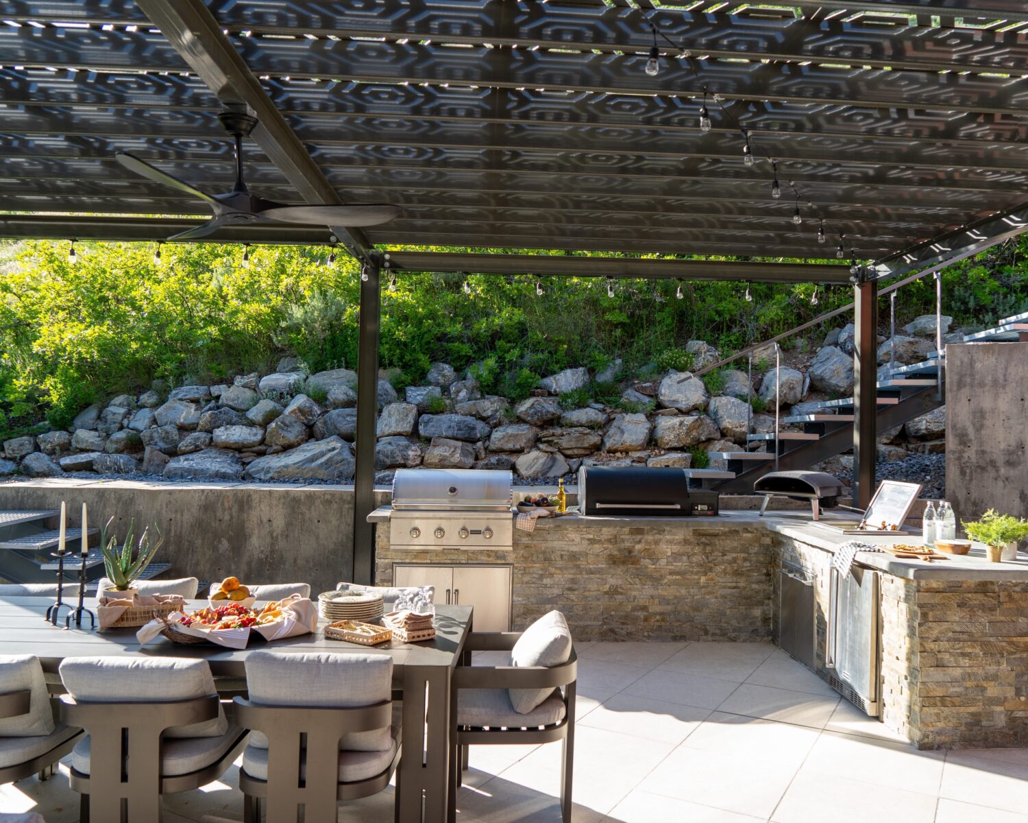 Nestled within its natural surroundings, this outdoor kitchen and dining area exudes harmony and elegance. Surrounded by rustic stone features, the space feels sculpted from the earth, blending effortlessly into the environment. At its center is a state-of-the-art kitchen with high-end appliances, combining functionality and style. Overhead, a large pergola provides shade while dappled sunlight filters through, enhancing the atmosphere. This inviting space is perfect for shared laughter, delicious meals, and a deep connection to nature.