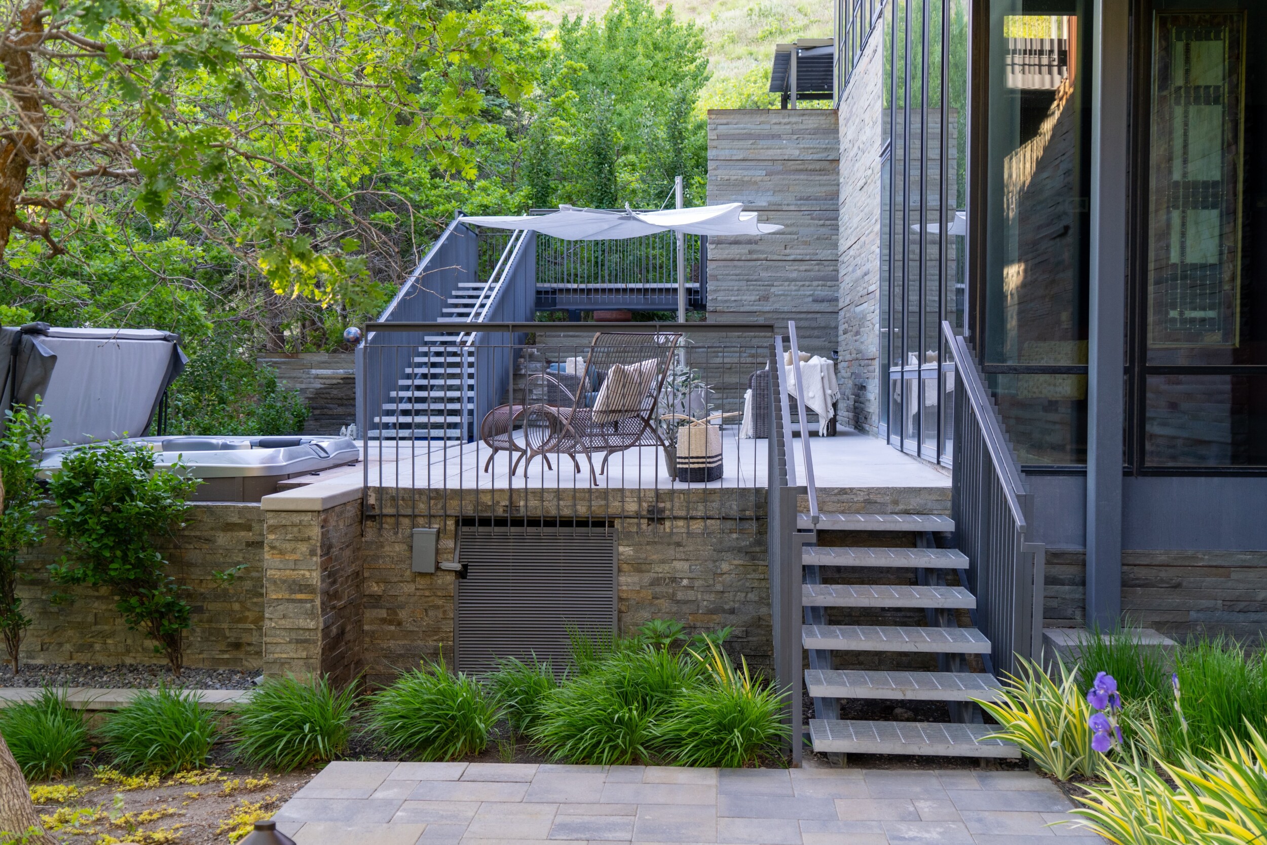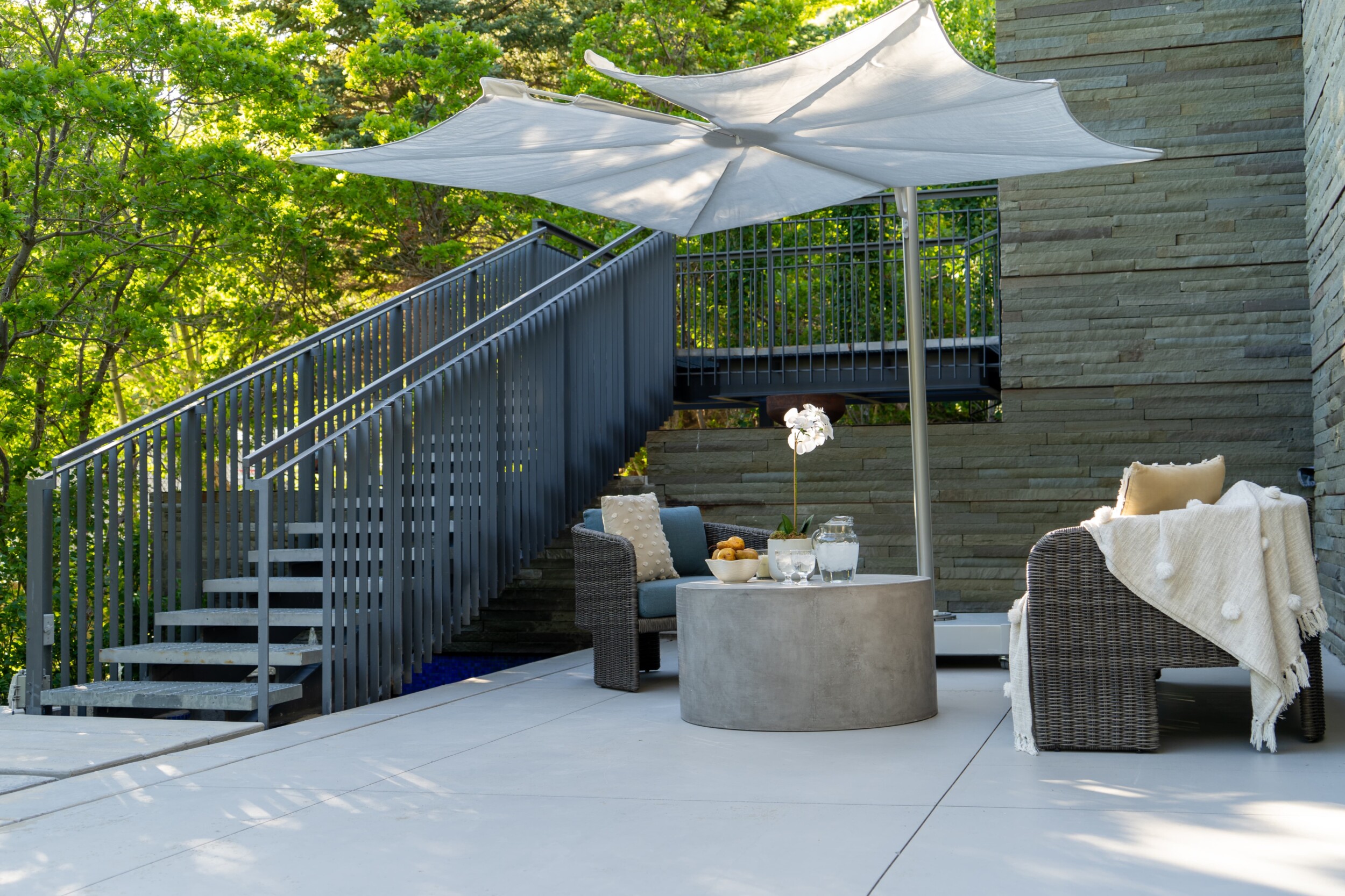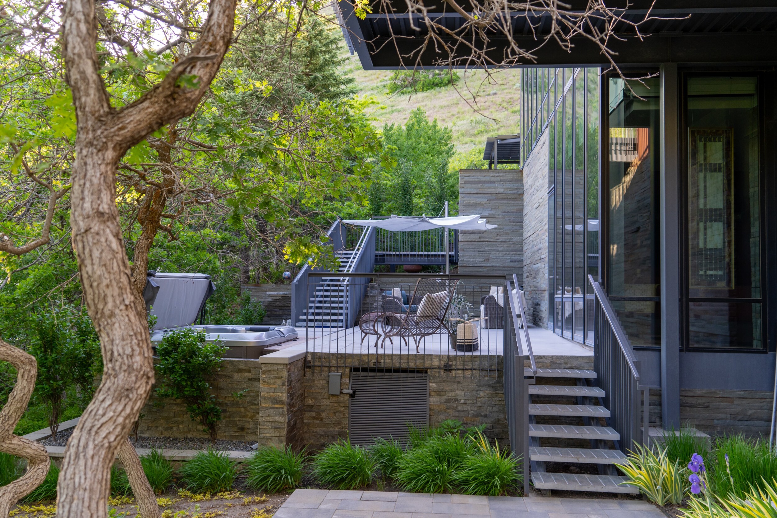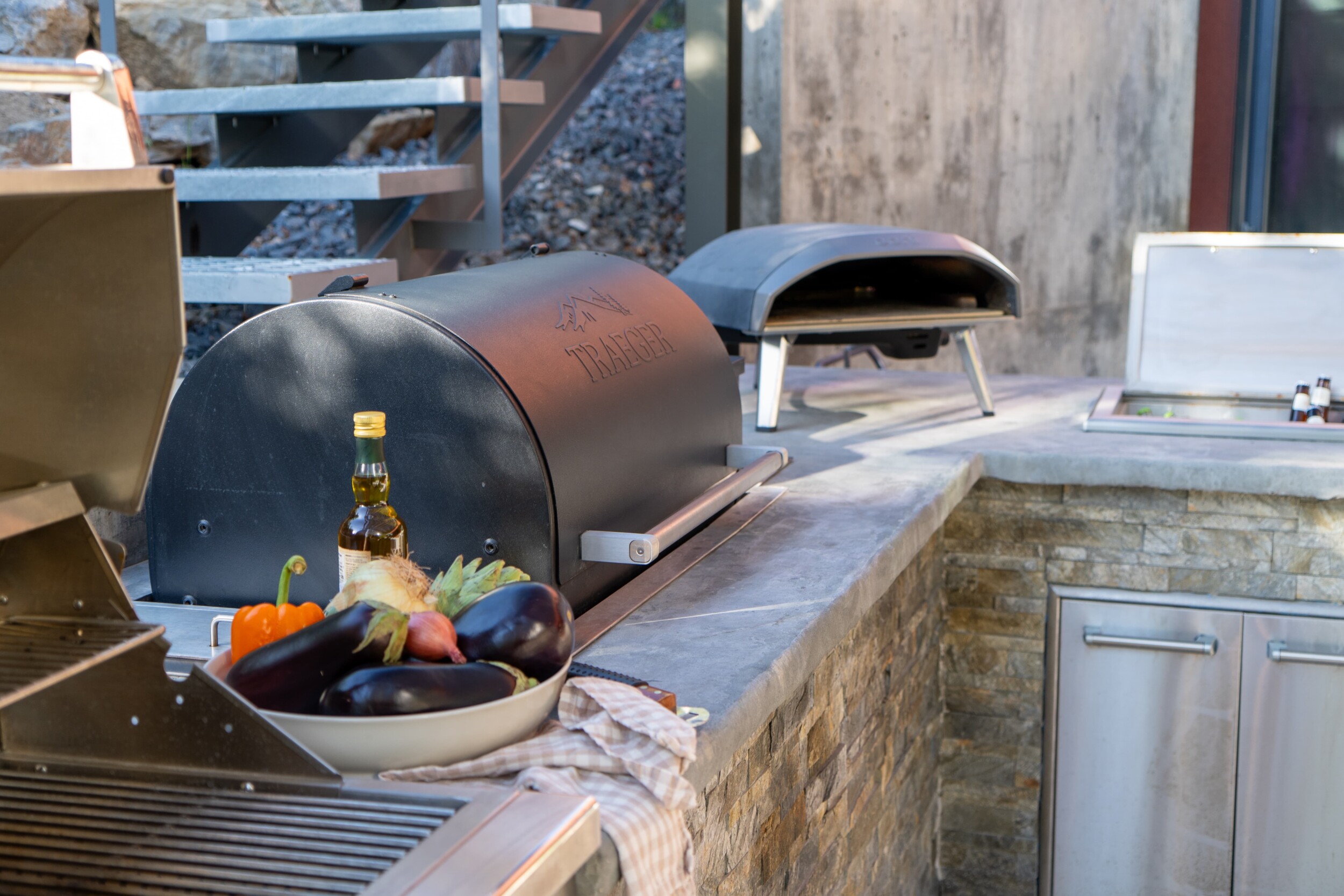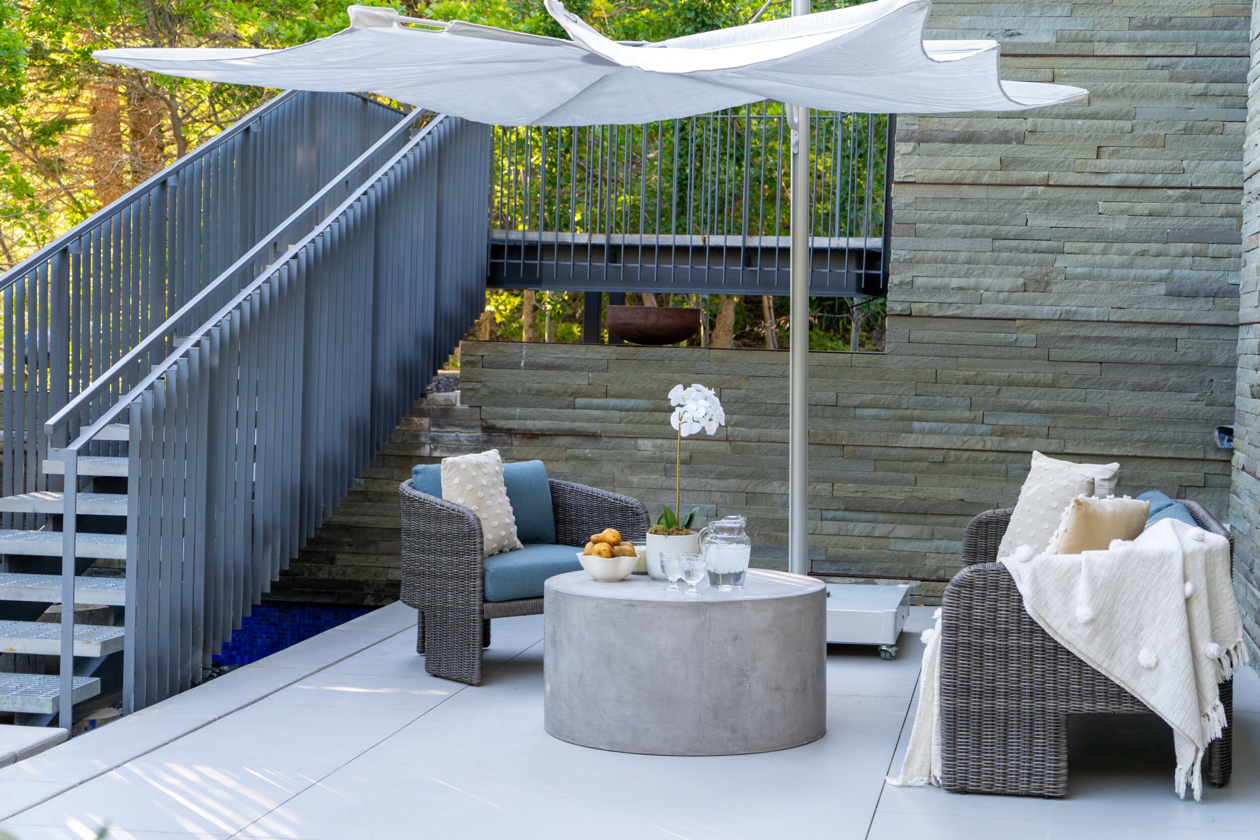 Nestled within its natural surroundings, this outdoor kitchen and dining area exudes harmony and elegance. Surrounded by rustic stone features, the space feels sculpted from the earth, blending effortlessly into the environment. At its center is a state-of-the-art kitchen with high-end appliances, combining functionality and style. Overhead, a large pergola provides shade while dappled sunlight filters through, enhancing the atmosphere. This inviting space is perfect for shared laughter, delicious meals, and a deep connection to nature.