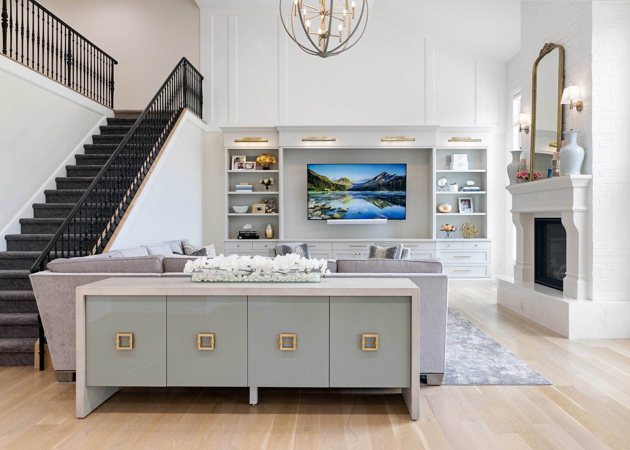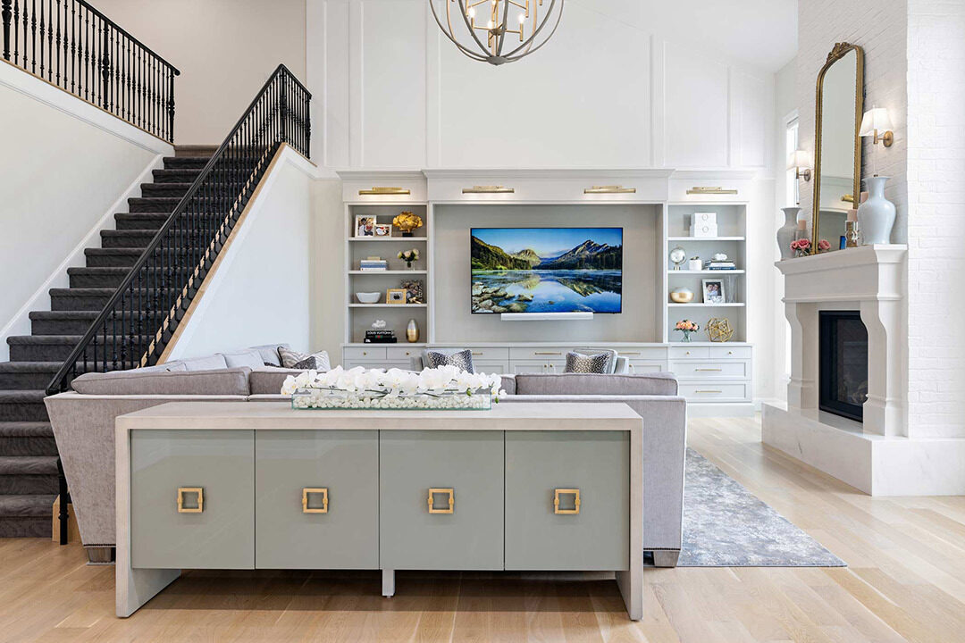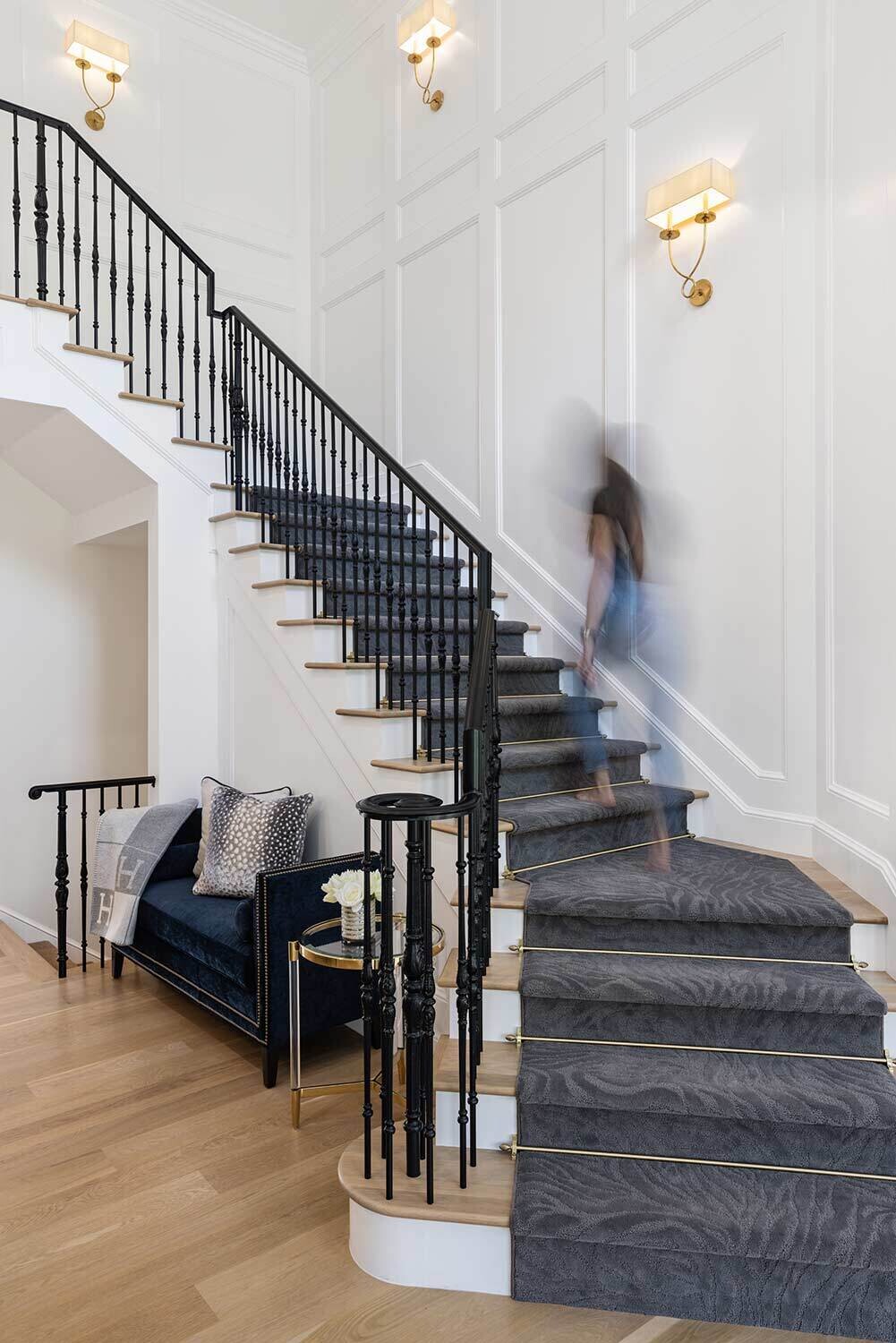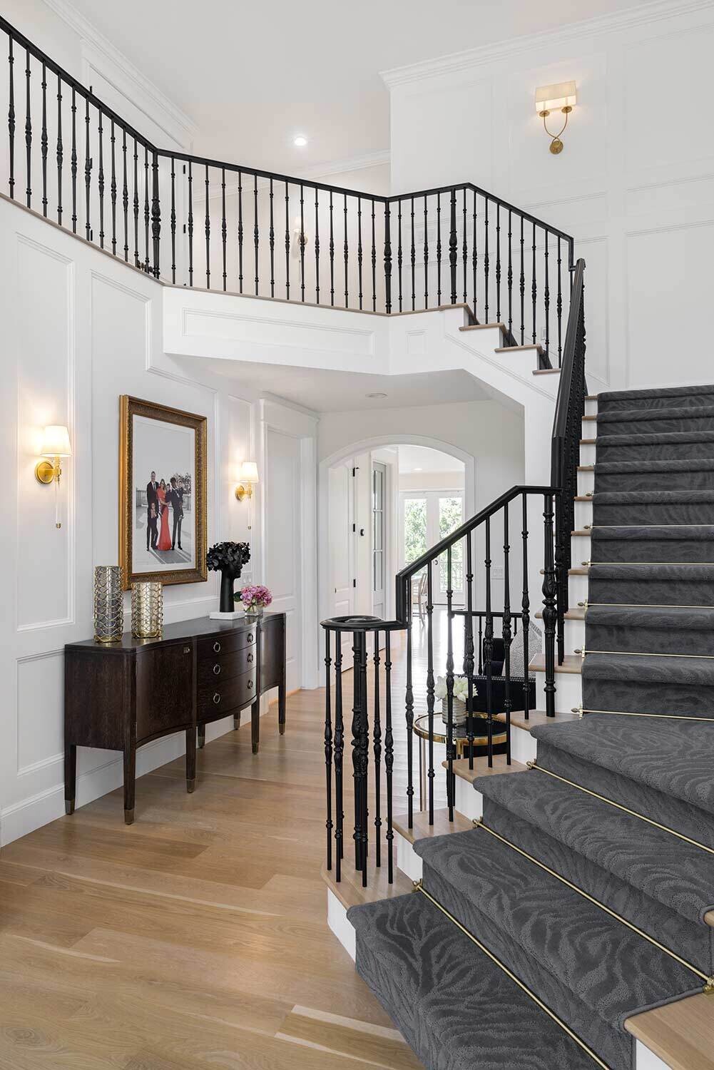 This transitional Draper design hits just the right balance between modern and traditional - from its wrought-iron foyer railings to the traditional wall molding details, and insertion of unexpected brass lighting touches.