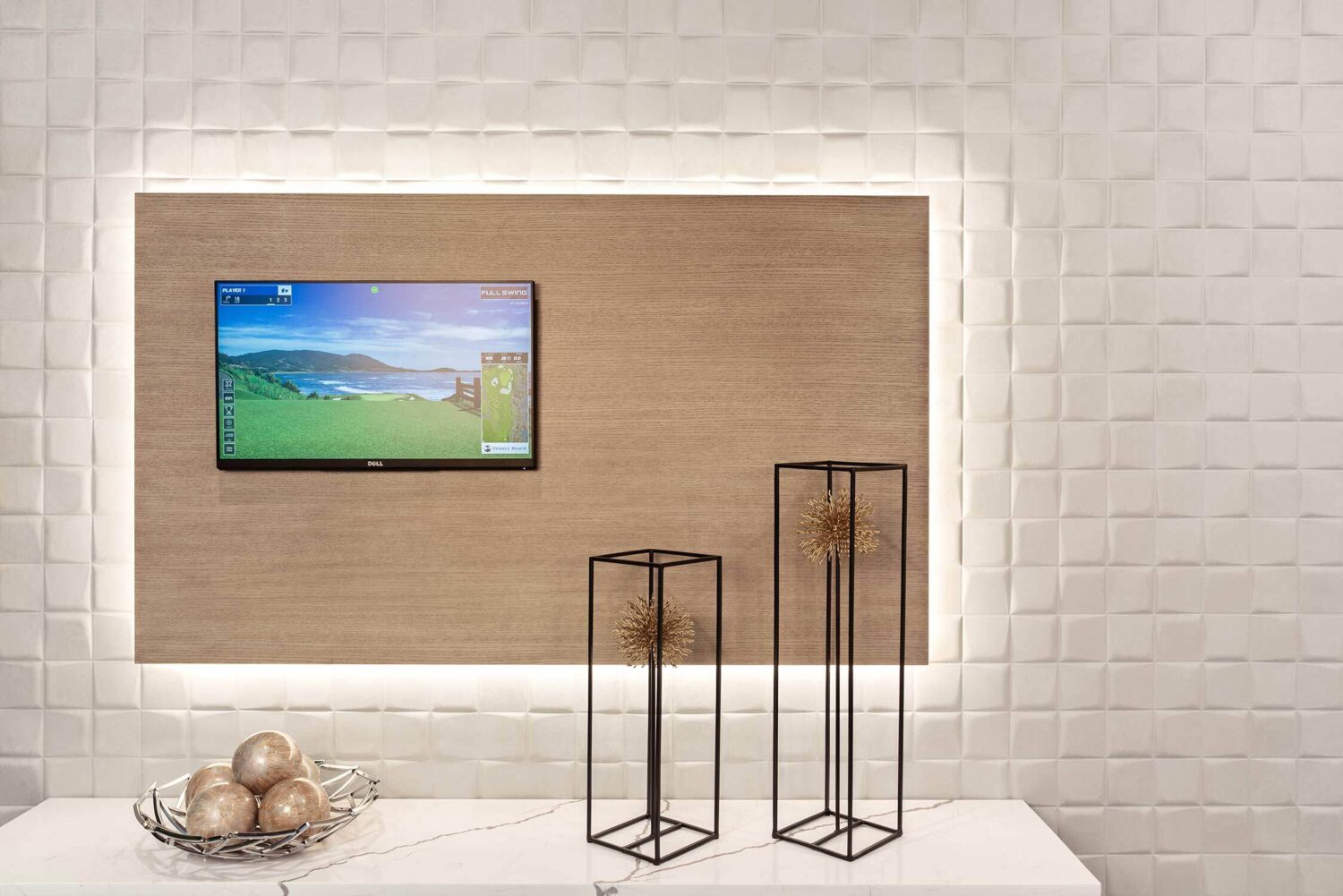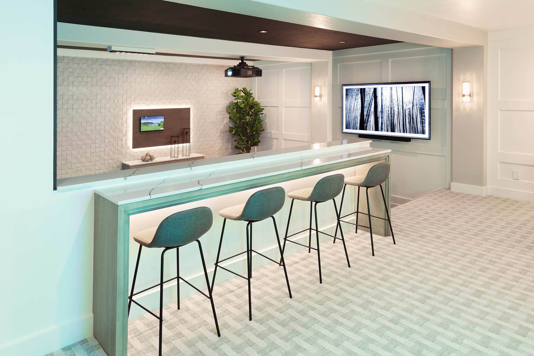 Looking to take your golf game to the next level? This basement allows its homeowners to practice their swing without leaving the house. Our residential team had fun reimagining this basement in an aesthetically pleasing way that's also functional. Lighting played a huge role in our design with a custom neon sign and uplighting that sets off bar seating.