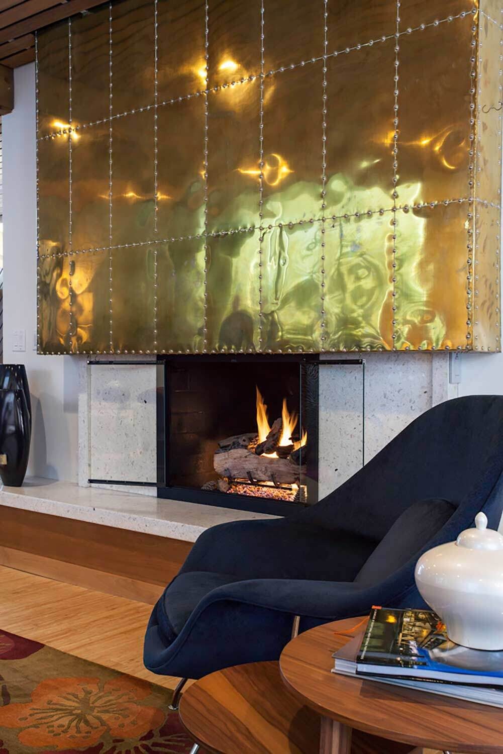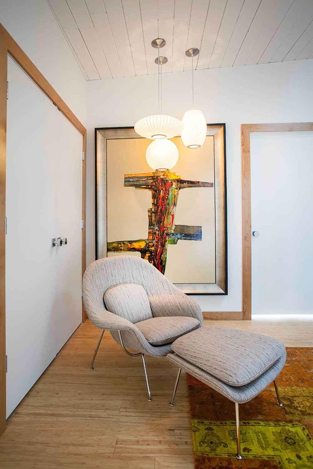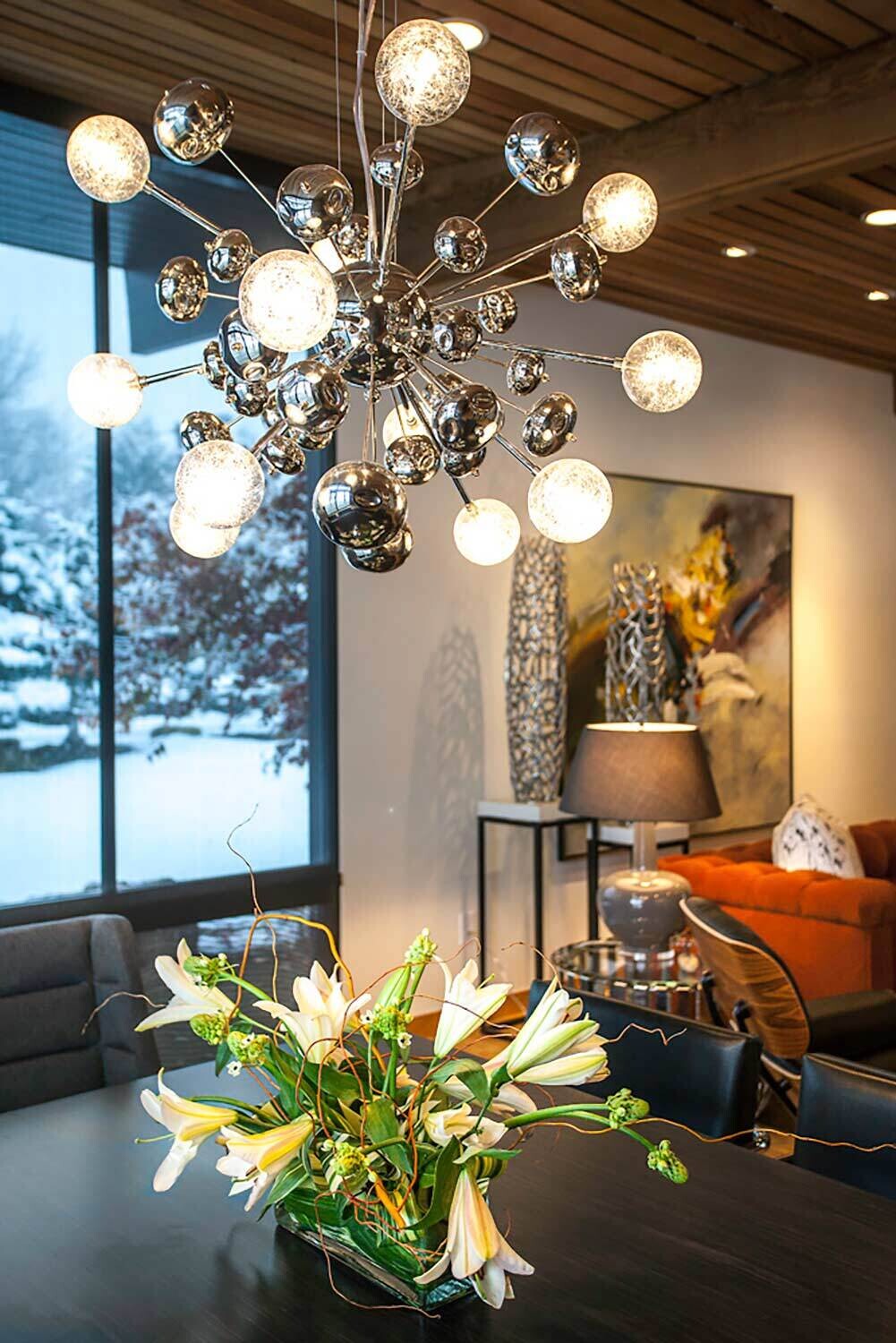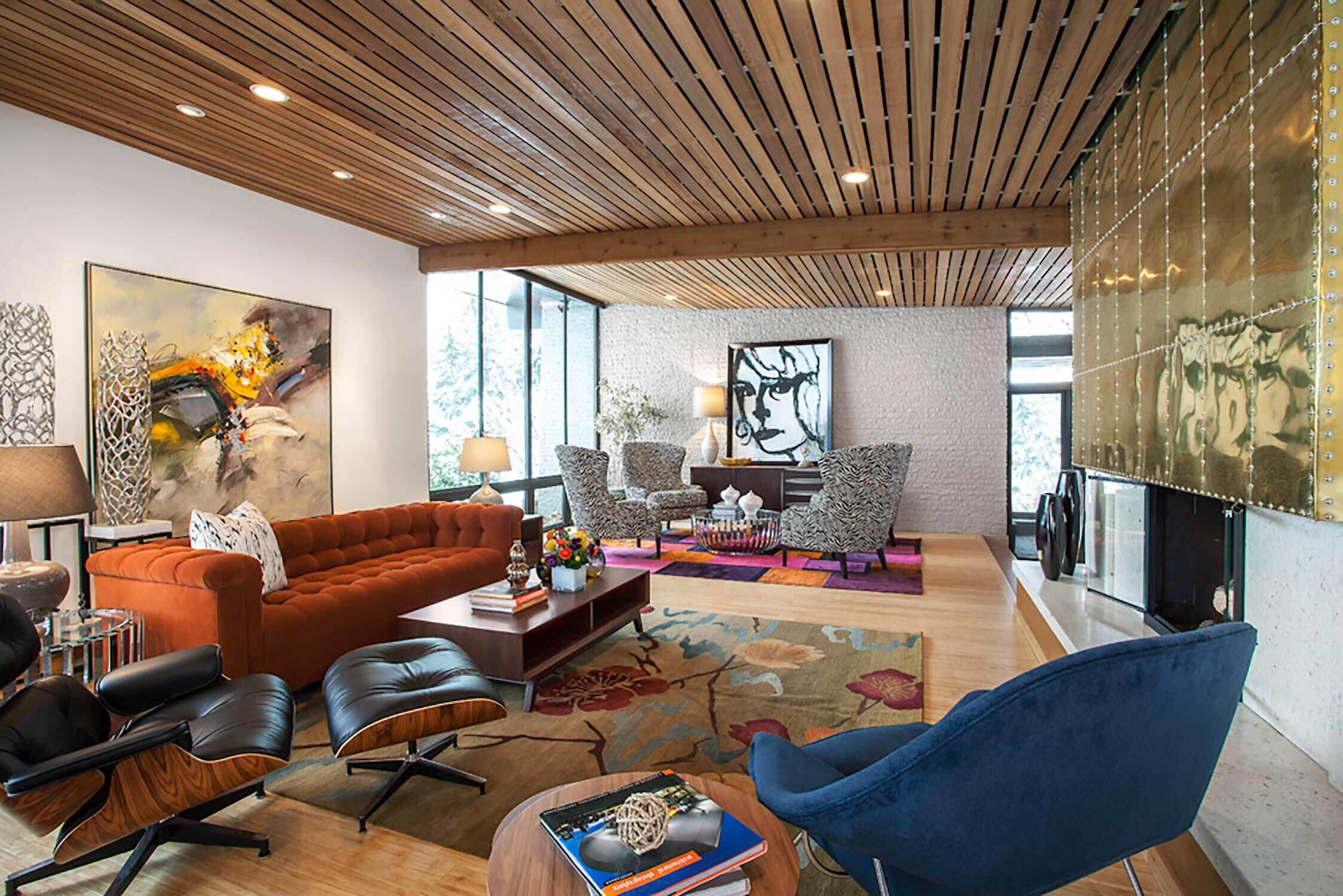 With its towering ceilings and spacious footprint, this mid-century stunner is a great example of playing with scale. We leaned into that roomy feel in the chef's kitchen and seemingly endless white walls dotted with bright accents. You can catch those pops of color in the art selection, the eye-catching fireplace, and furnishings.