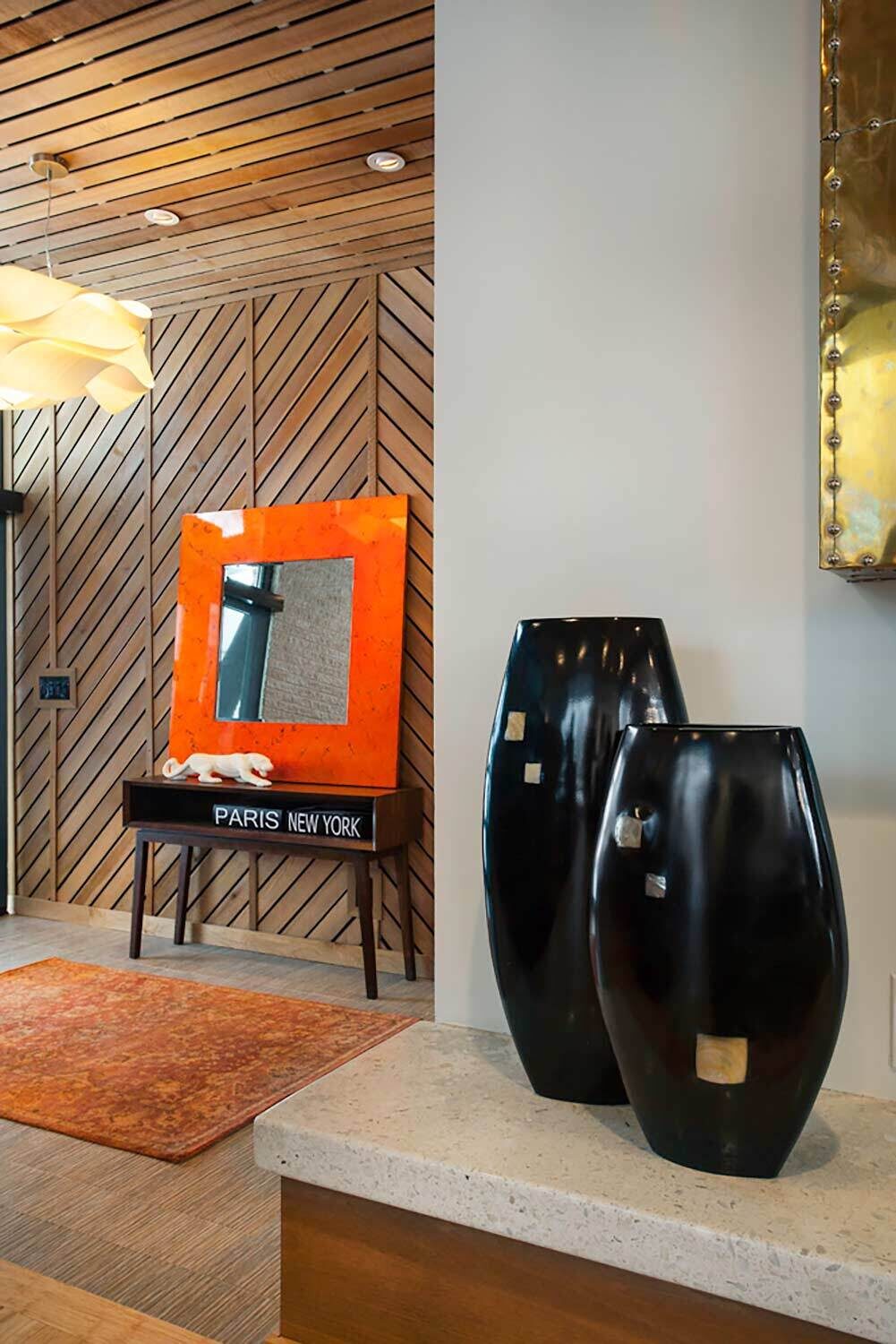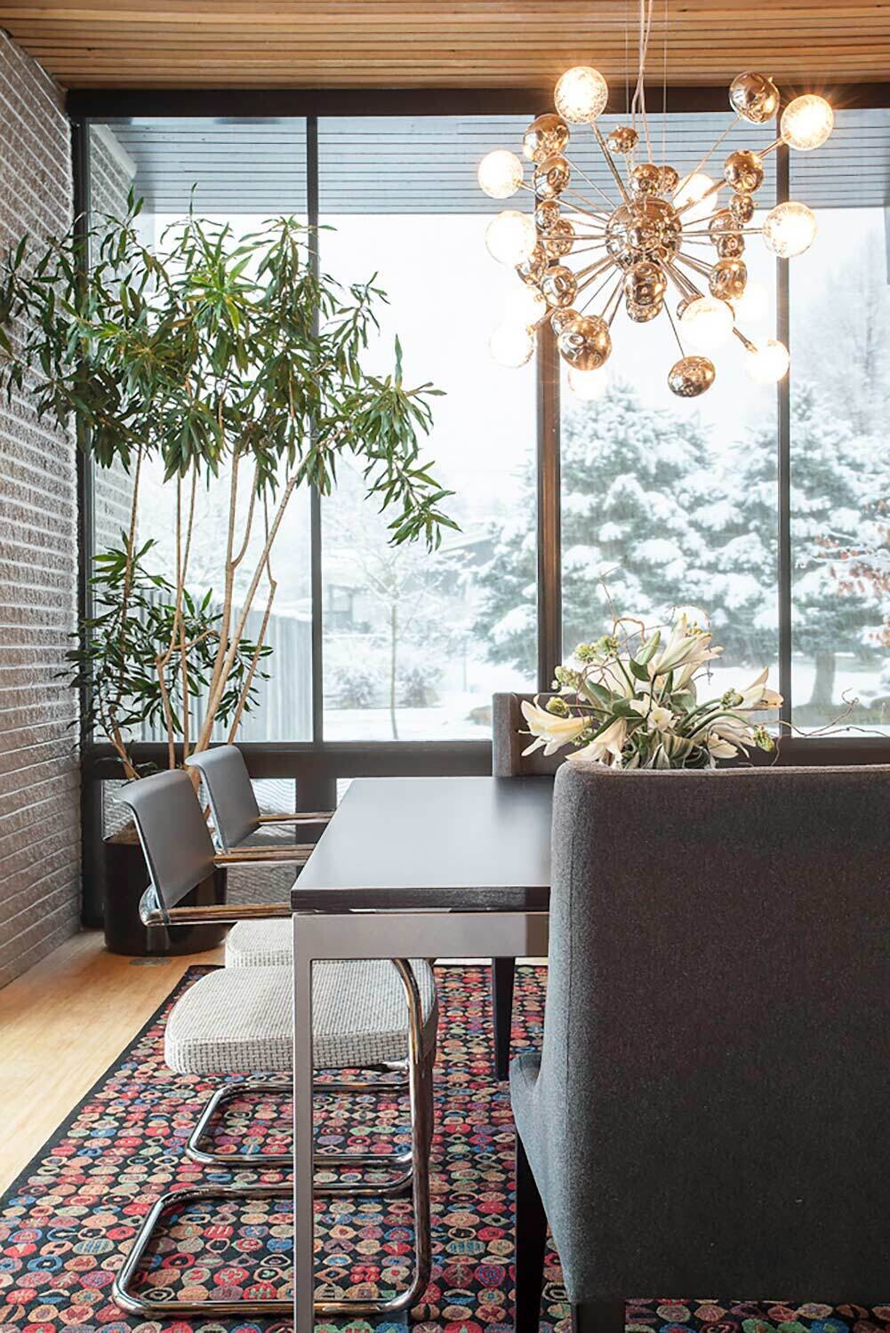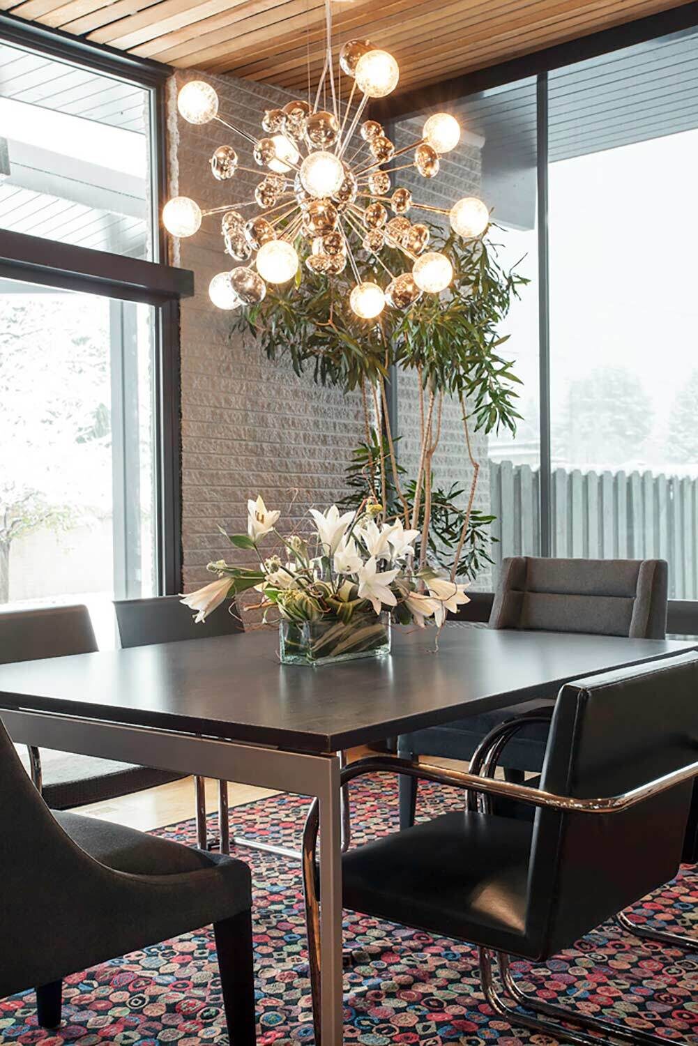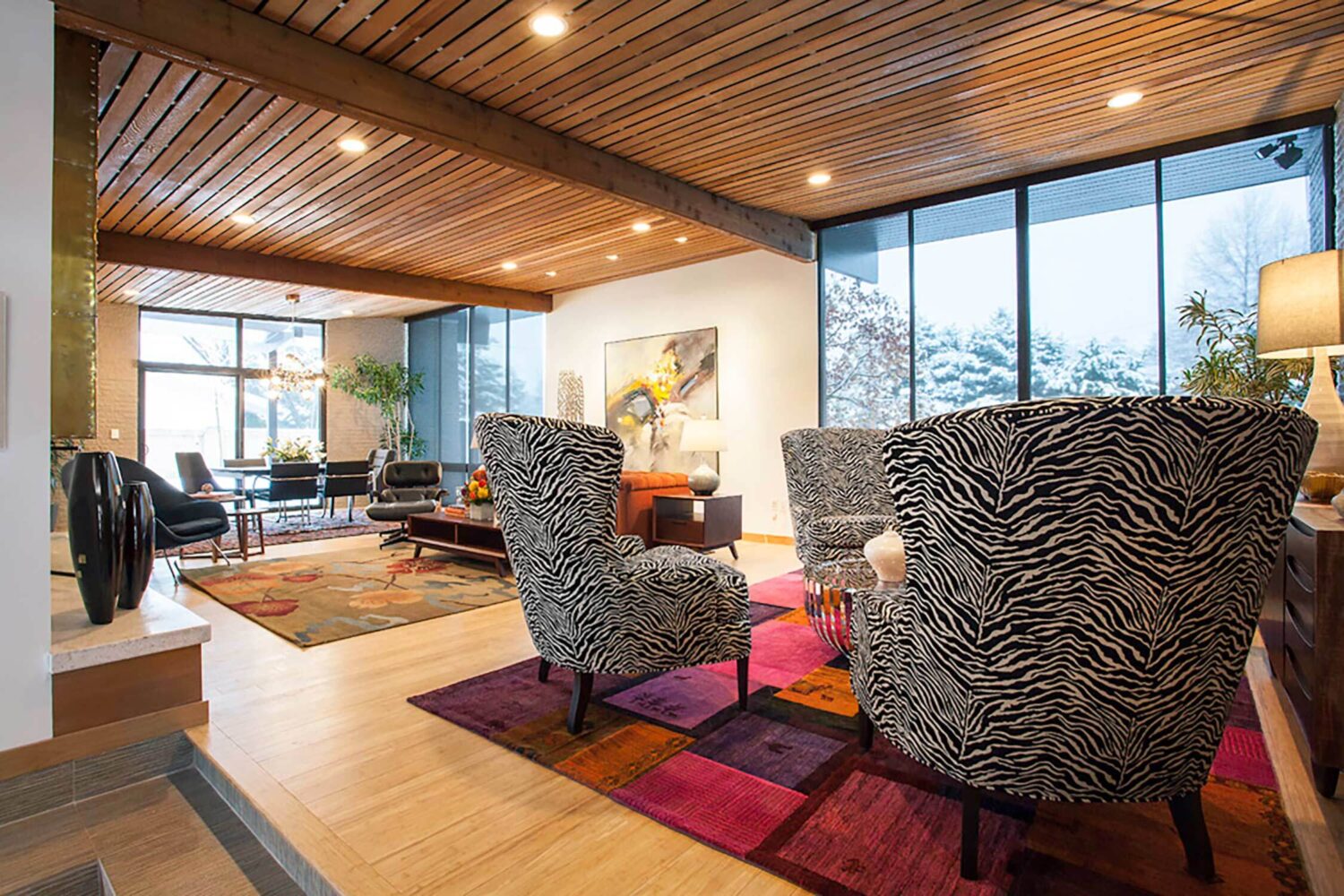 With its towering ceilings and spacious footprint, this mid-century stunner is a great example of playing with scale. We leaned into that roomy feel in the chef's kitchen and seemingly endless white walls dotted with bright accents. You can catch those pops of color in the art selection, the eye-catching fireplace, and furnishings.