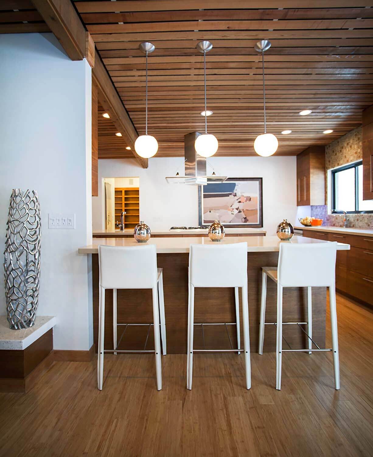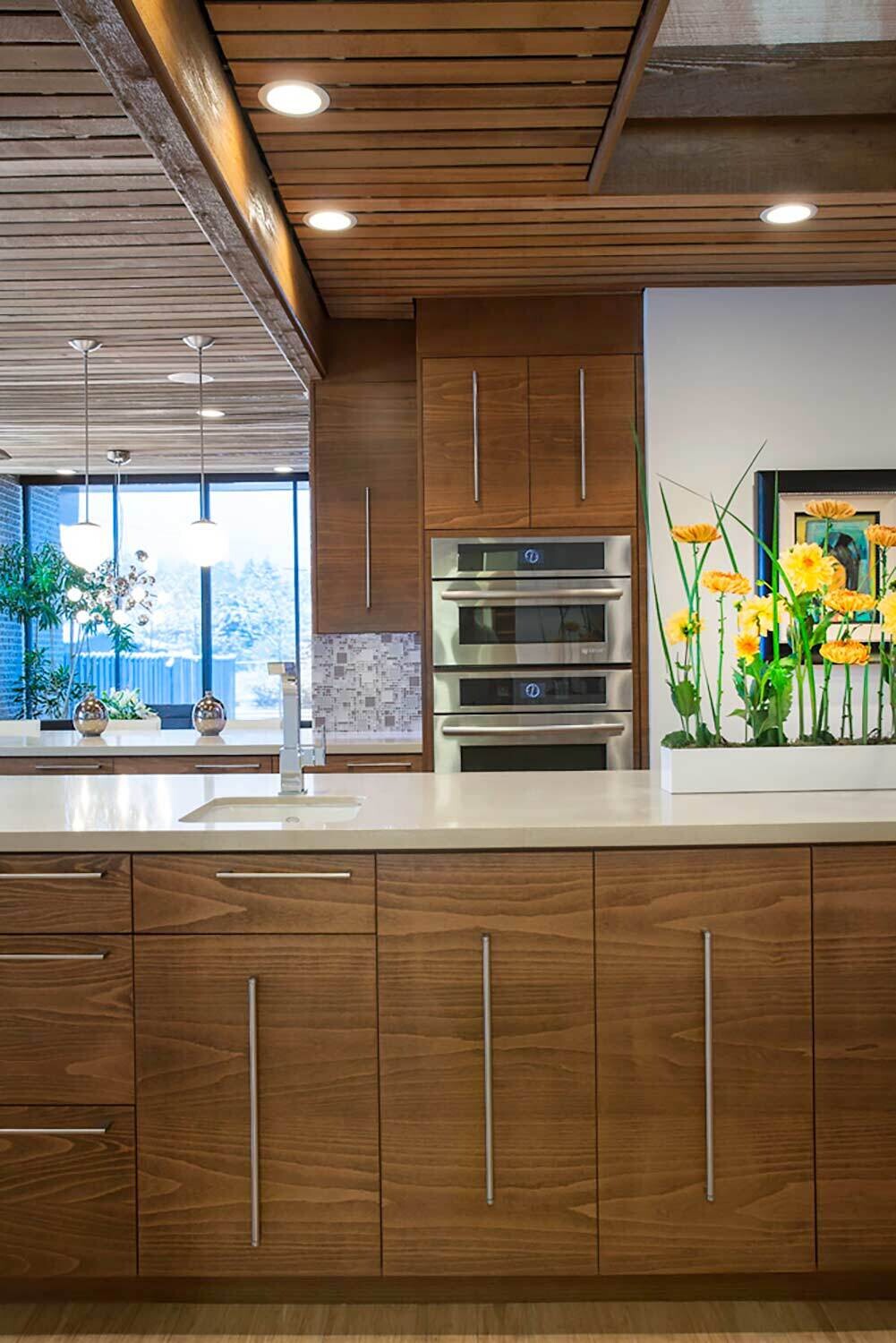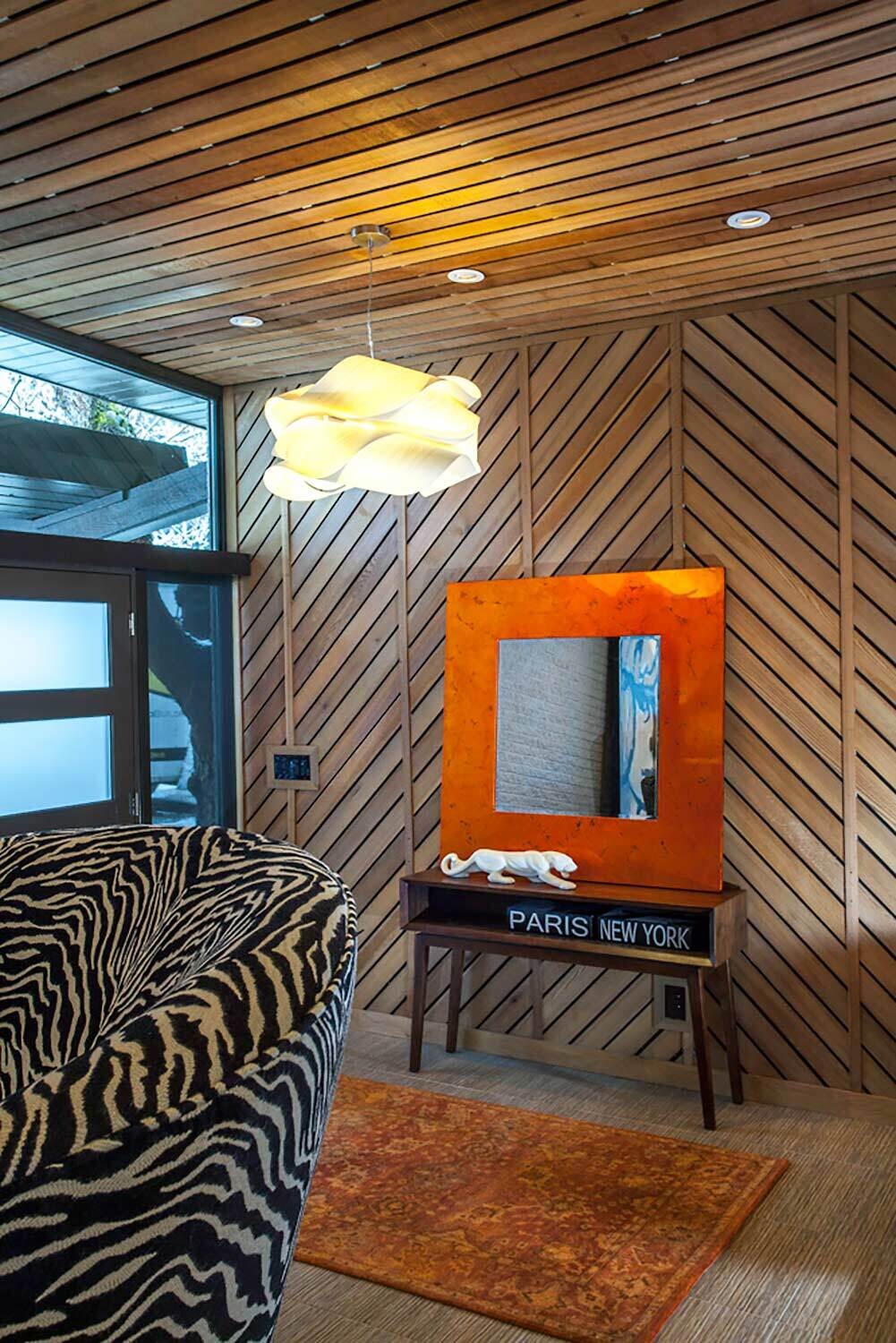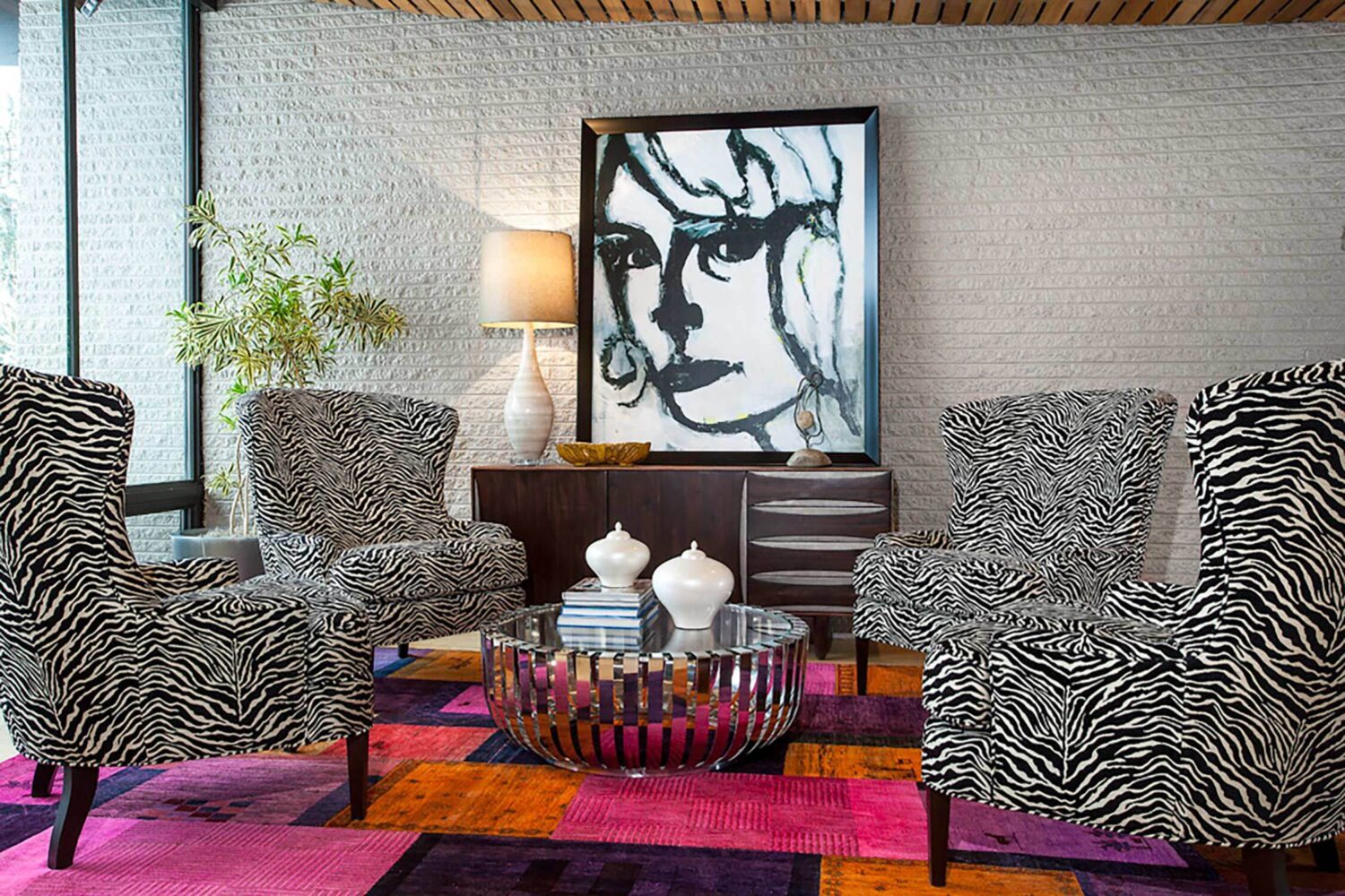 With its towering ceilings and spacious footprint, this mid-century stunner is a great example of playing with scale. We leaned into that roomy feel in the chef's kitchen and seemingly endless white walls dotted with bright accents. You can catch those pops of color in the art selection, the eye-catching fireplace, and furnishings.