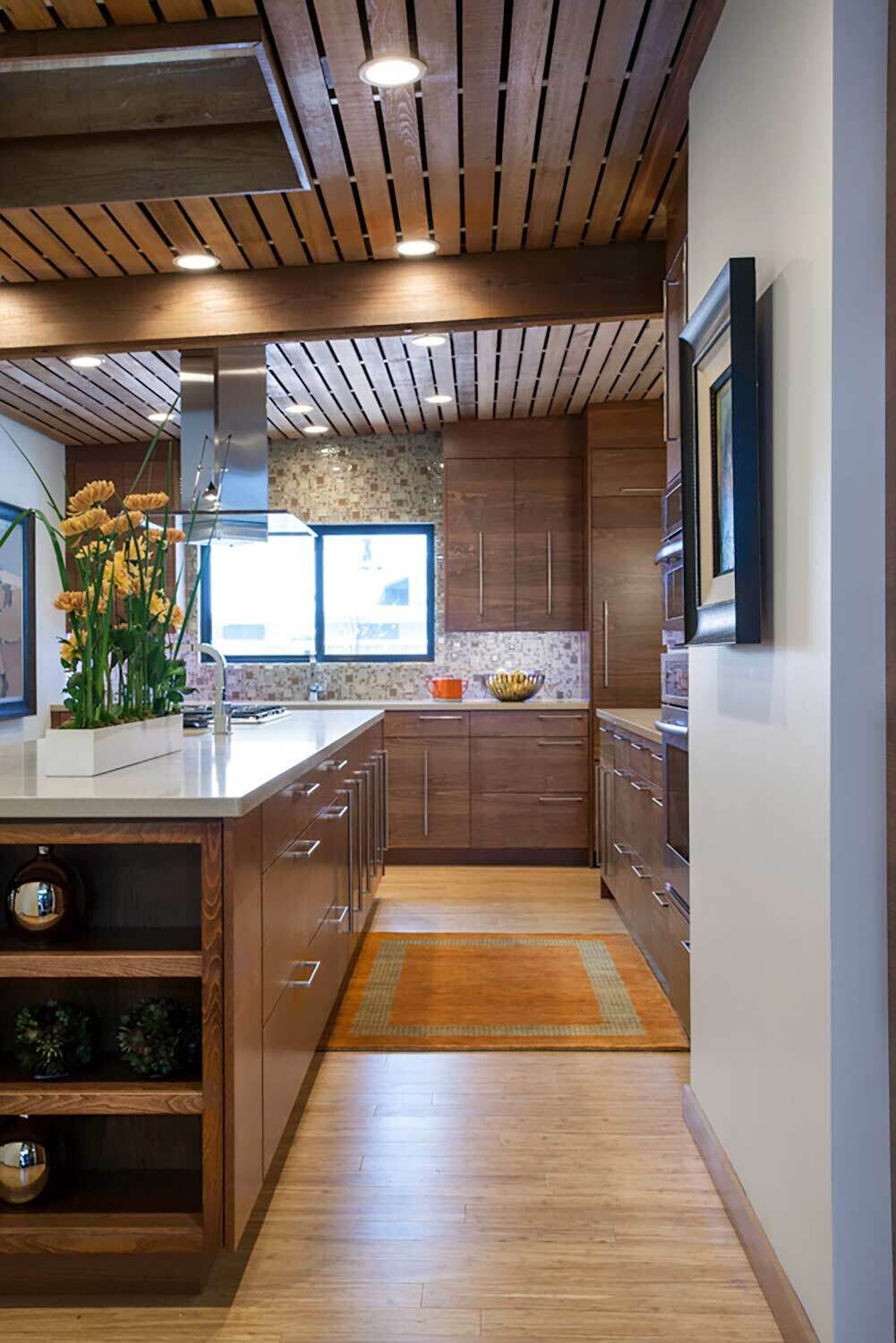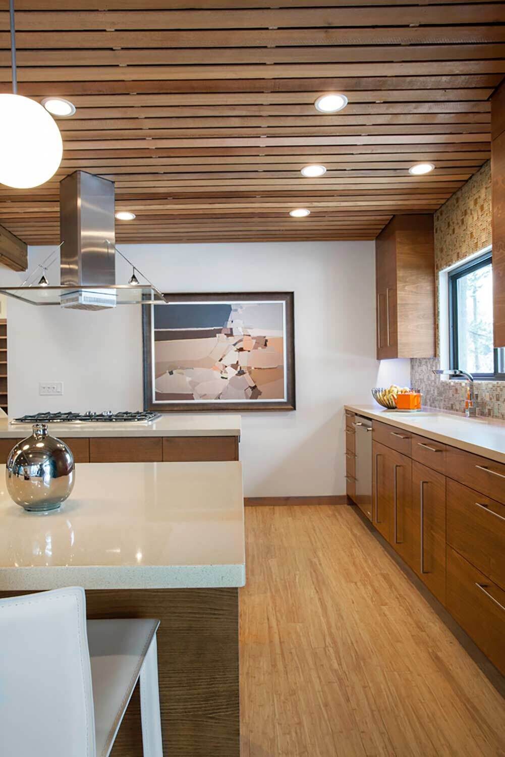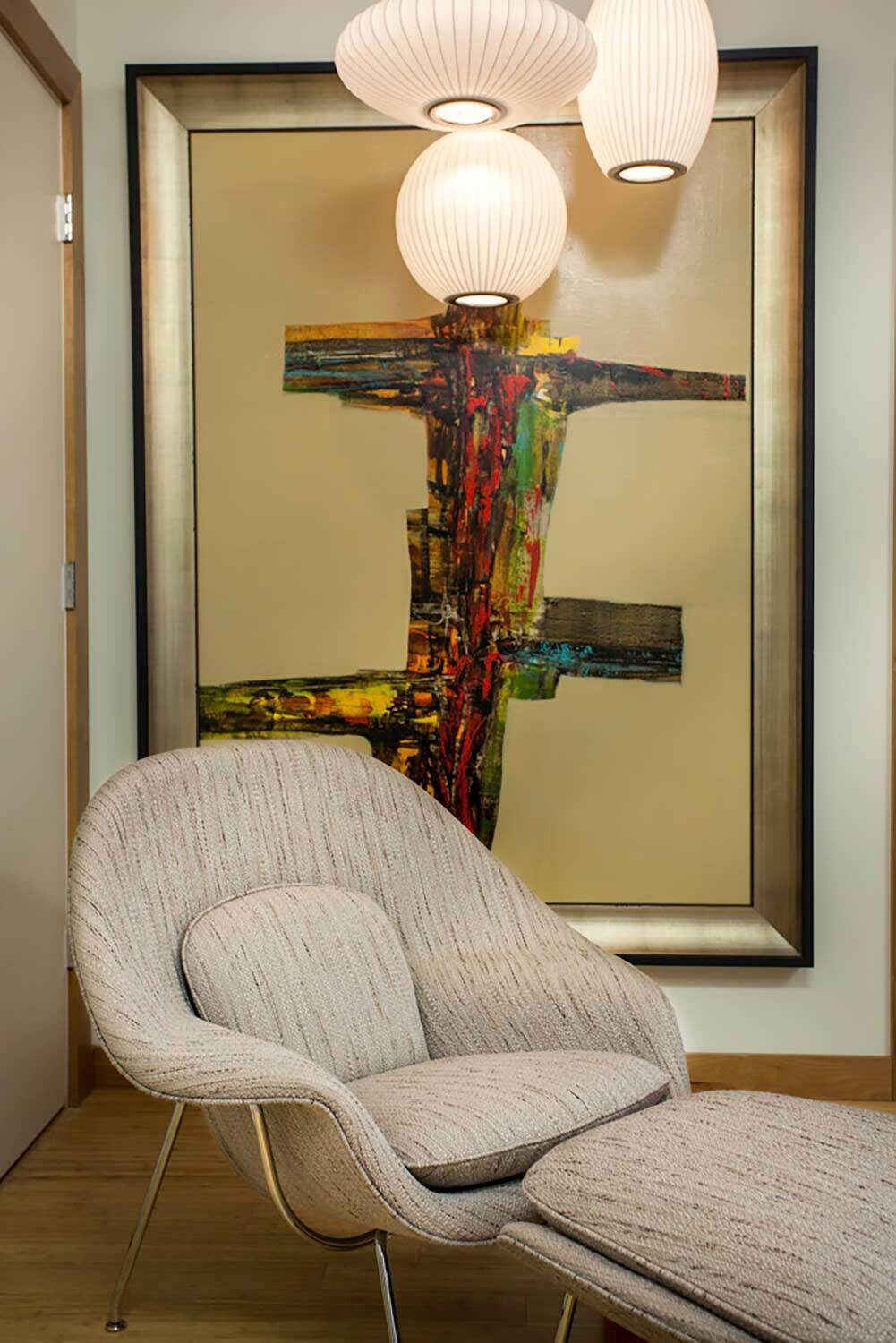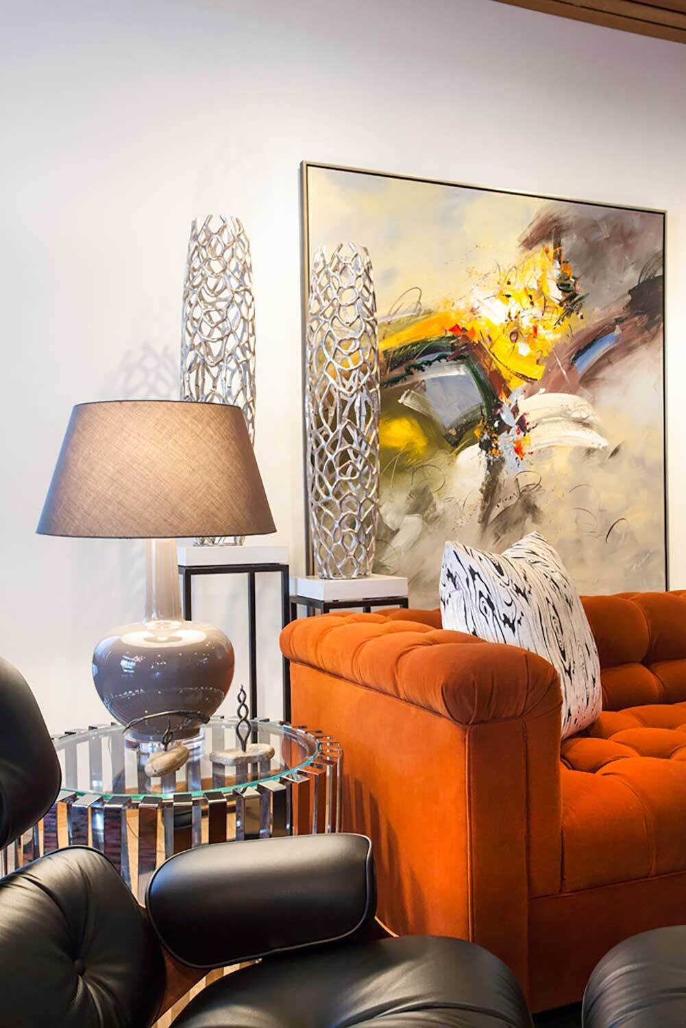 With its towering ceilings and spacious footprint, this mid-century stunner is a great example of playing with scale. We leaned into that roomy feel in the chef's kitchen and seemingly endless white walls dotted with bright accents. You can catch those pops of color in the art selection, the eye-catching fireplace, and furnishings.