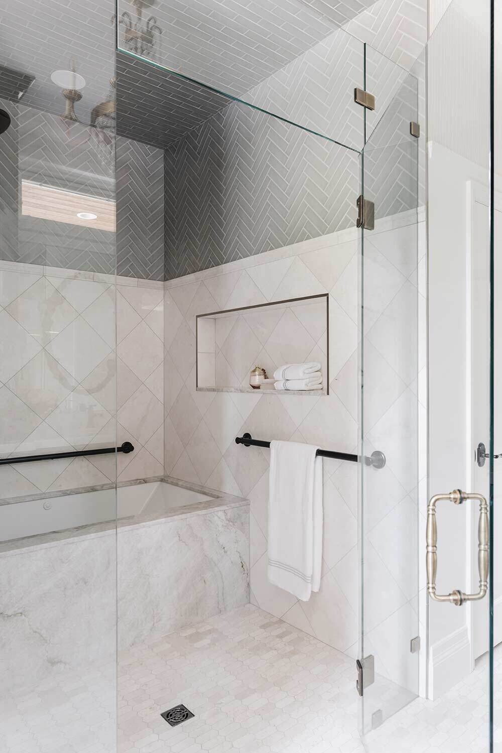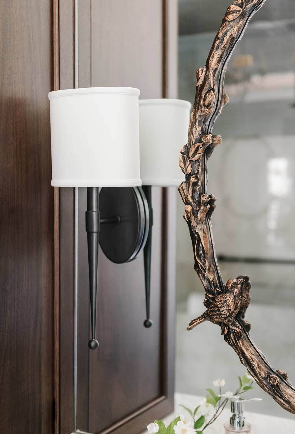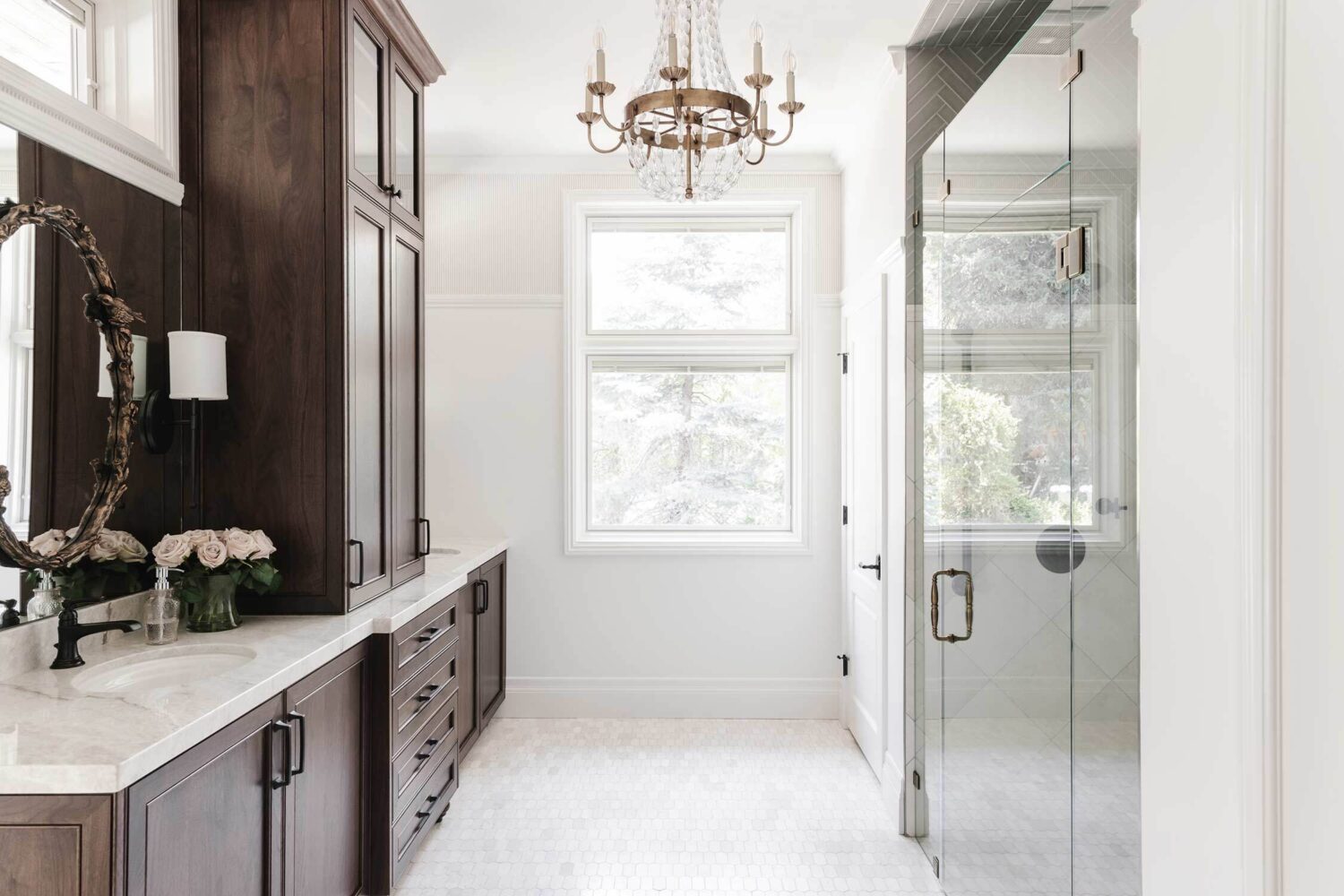The master bathroom is one of our favorite spots to invest in a few eye-catching details that scream upscale and classic. In this classic bathroom remodel, we were able to achieve that feel with an airy chandelier, a bronze mirror detail and our favorite - his and her washrooms for the ultimate in chic privacy.