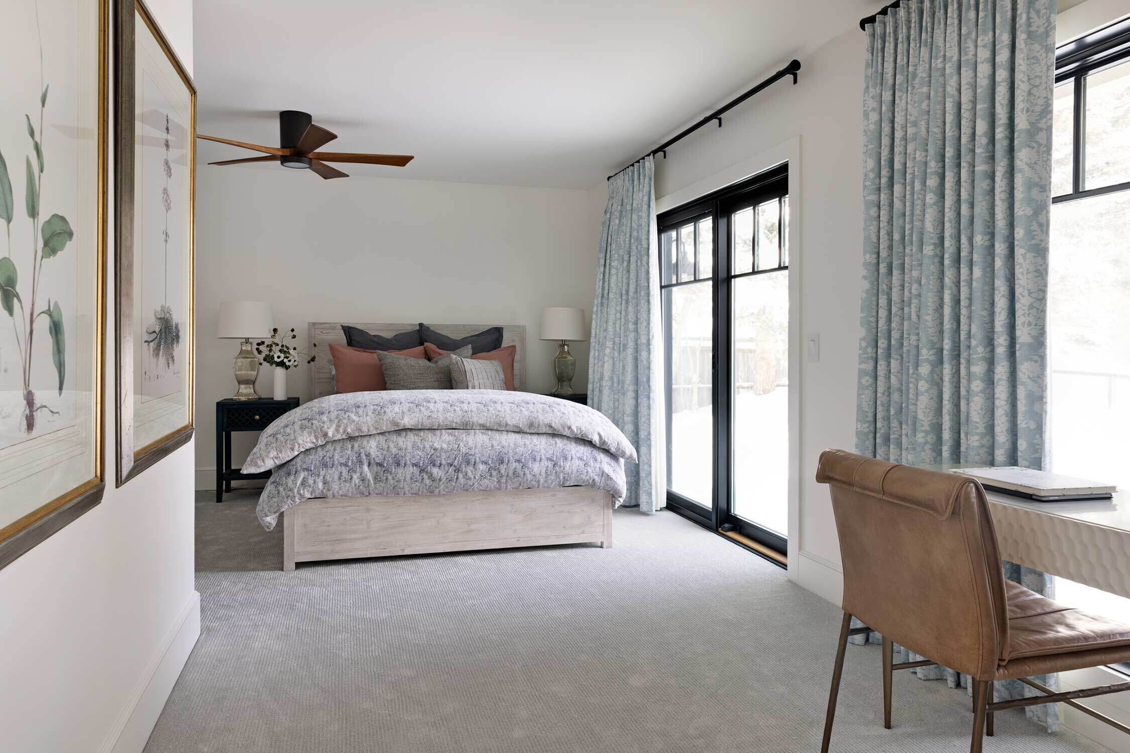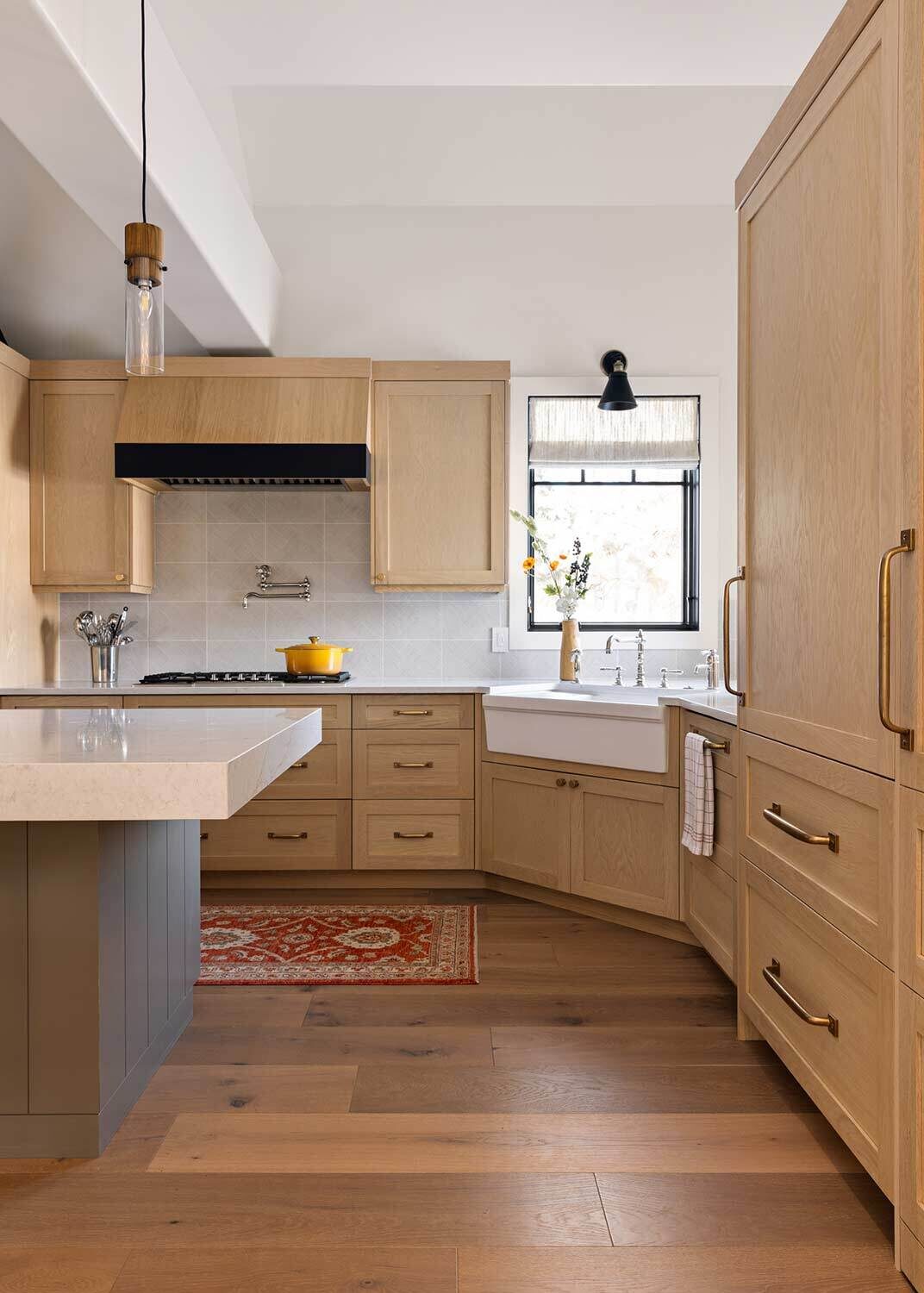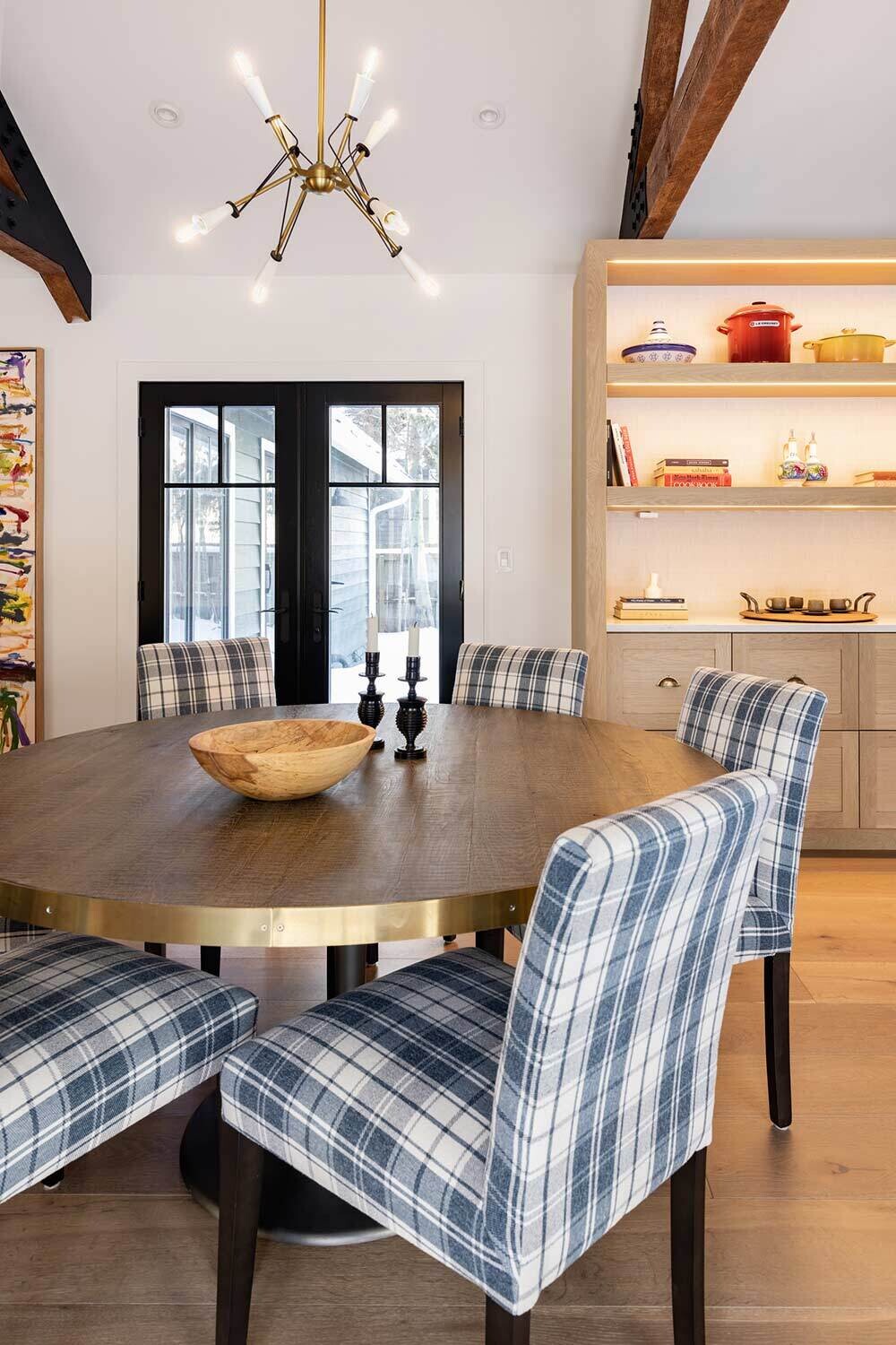 This Park City beauty strikes the right balance between subtle color and texture and eye-catching detail. Case in point? The structural wooden detail in the kitchen ceiling, the color and molding in the bathtub surround and the pointed lighting elements that bring focus to the built-ins. One fun aspect - the usage of multiple wood tones, sometimes in the same room - that help us realize that transitional interior design feel.