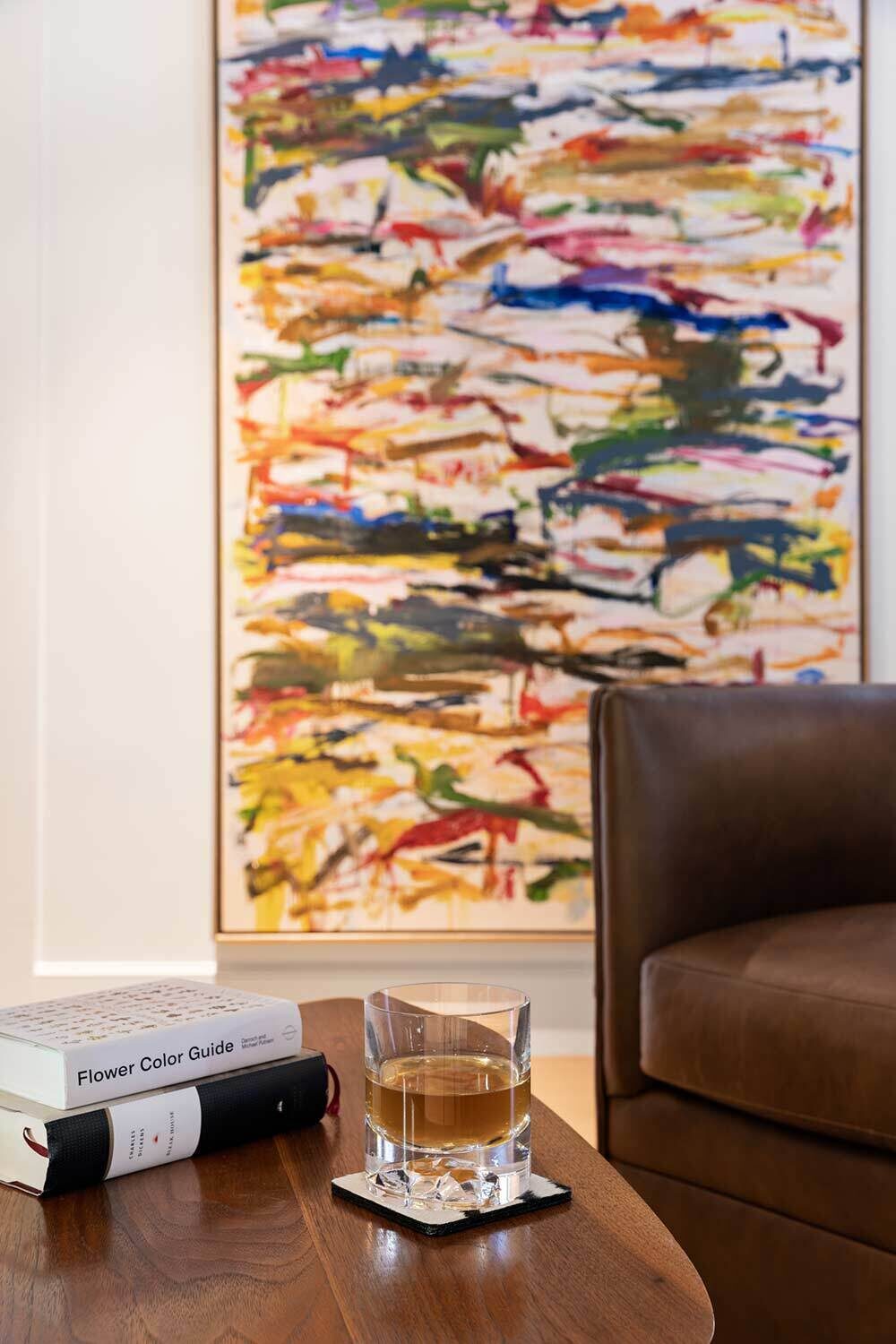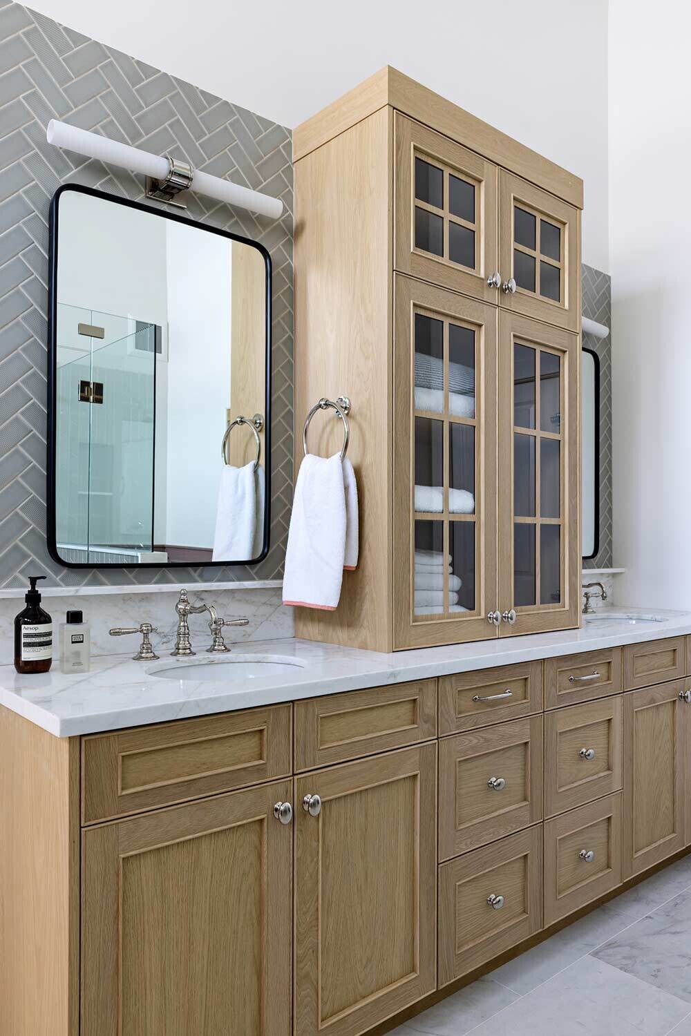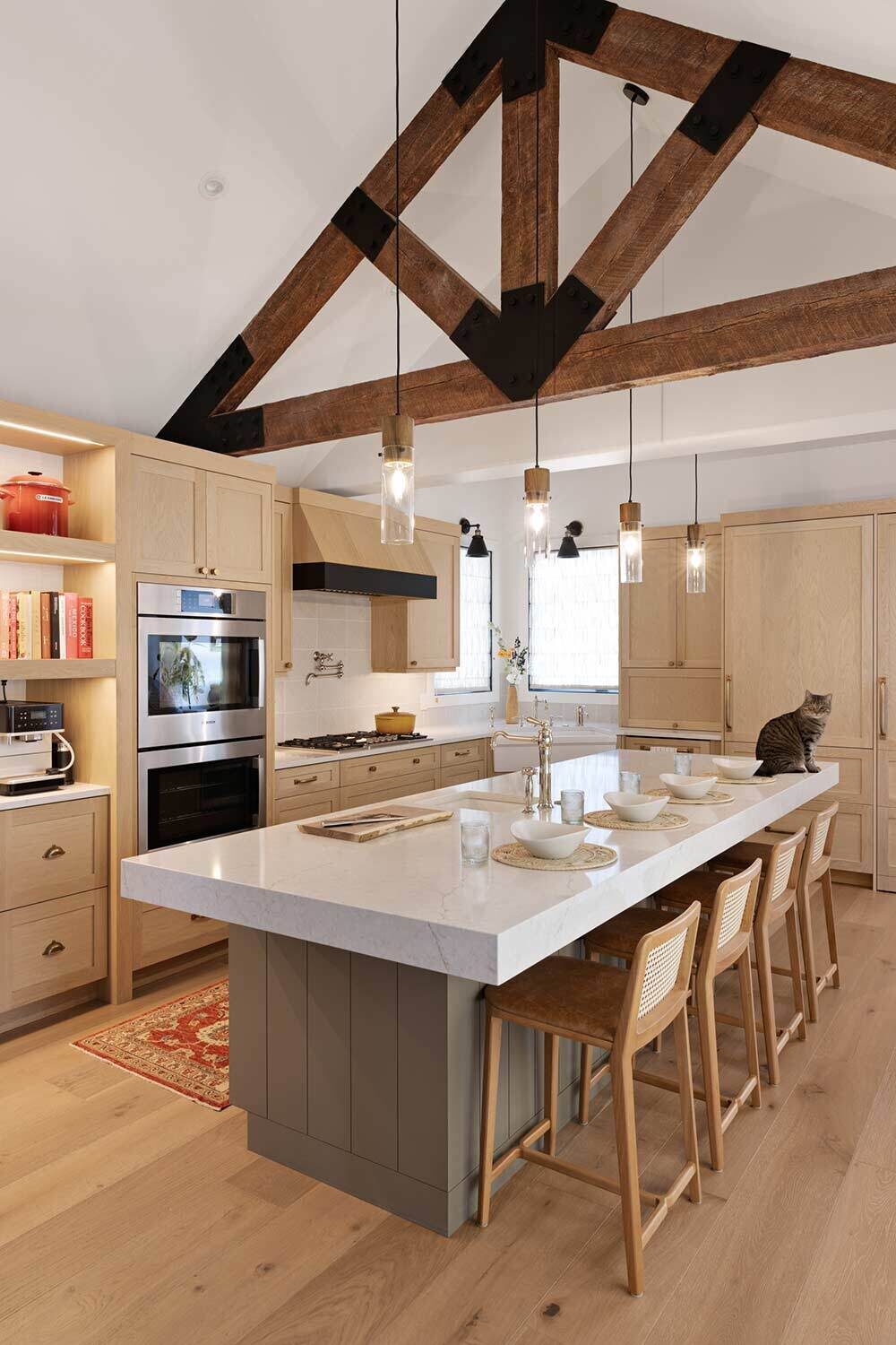 This Park City beauty strikes the right balance between subtle color and texture and eye-catching detail. Case in point? The structural wooden detail in the kitchen ceiling, the color and molding in the bathtub surround and the pointed lighting elements that bring focus to the built-ins. One fun aspect - the usage of multiple wood tones, sometimes in the same room - that help us realize that transitional interior design feel.