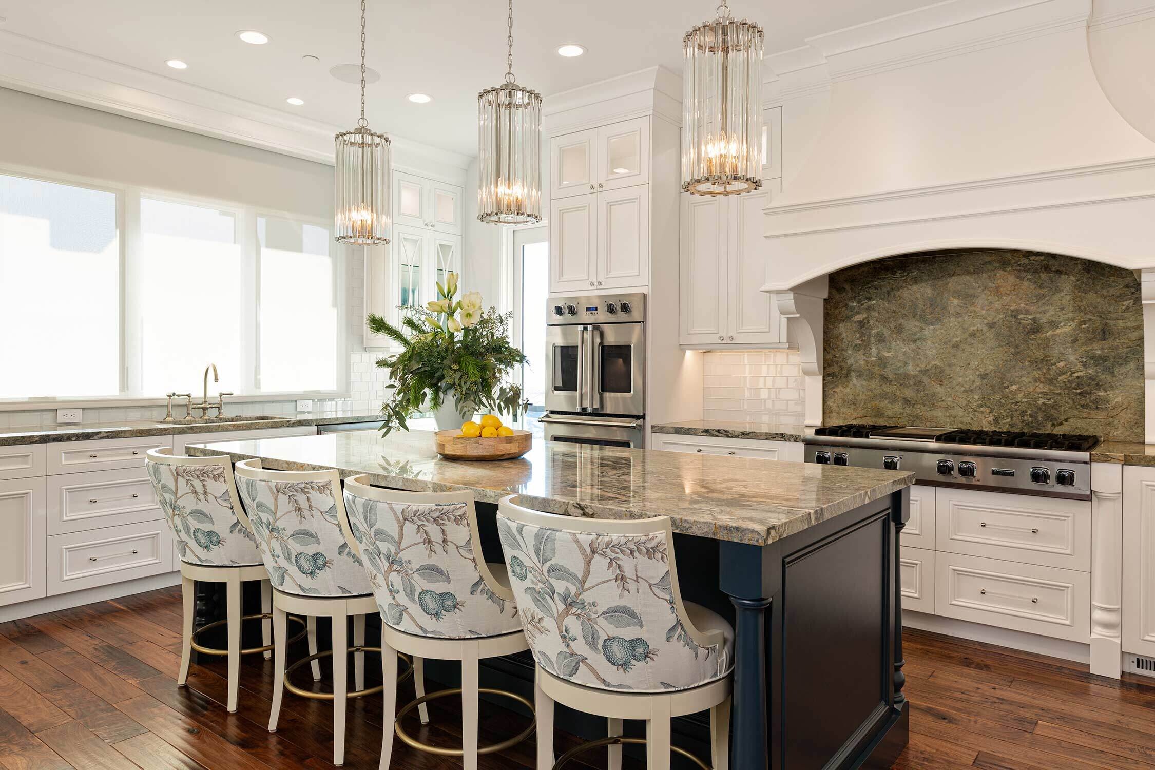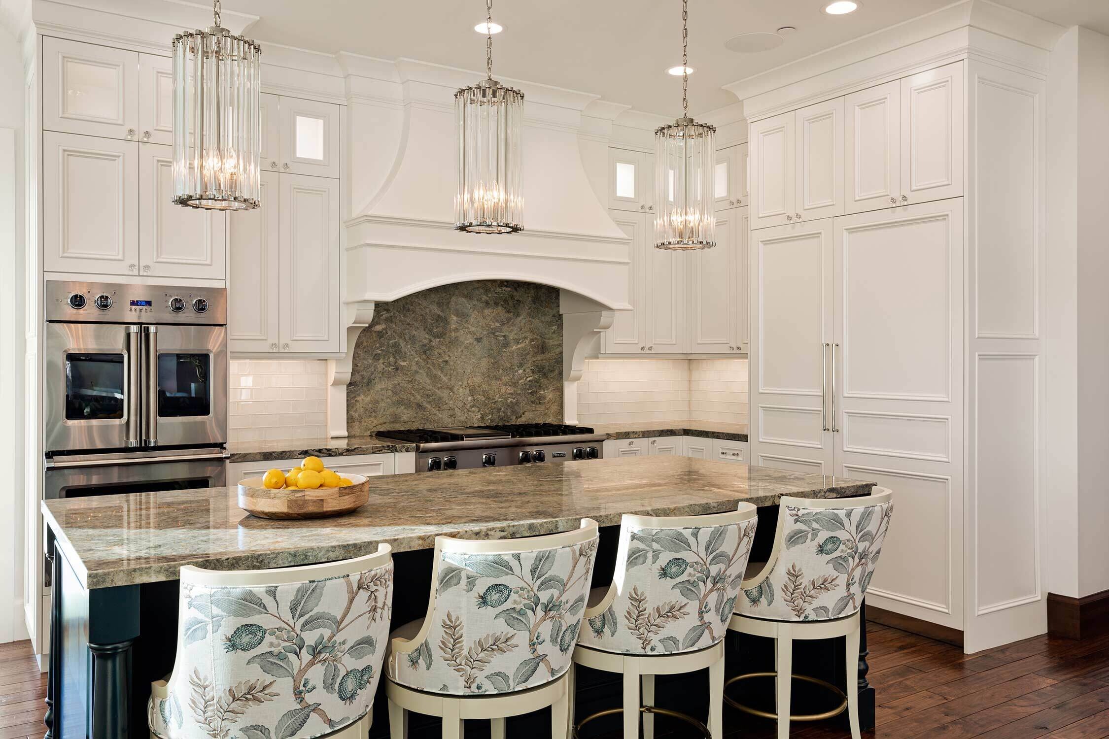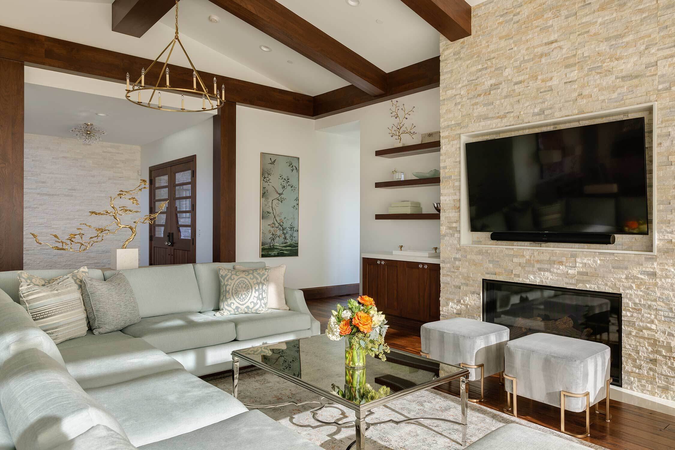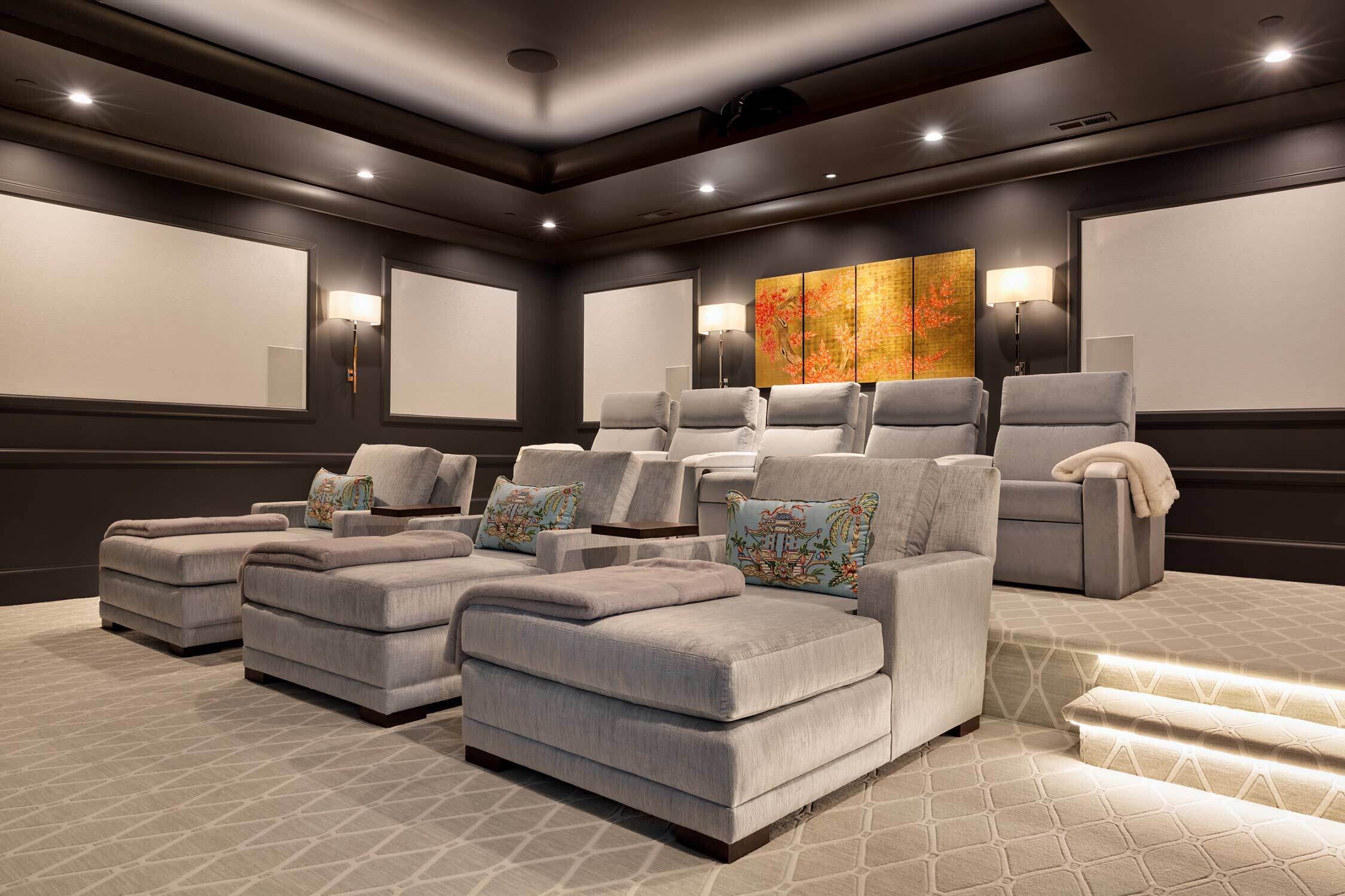 When our residential team tackles a full-house renovation, we take extra care to create a cohesive thread between each space. We can achieve that through complementary patterns, repeating materials (without feeling matchy-matchy) and the usage of a consistent color palette. One of our favorite aspects of this project? Check out the ceiling details in the open kitchen, living room, and theater room!