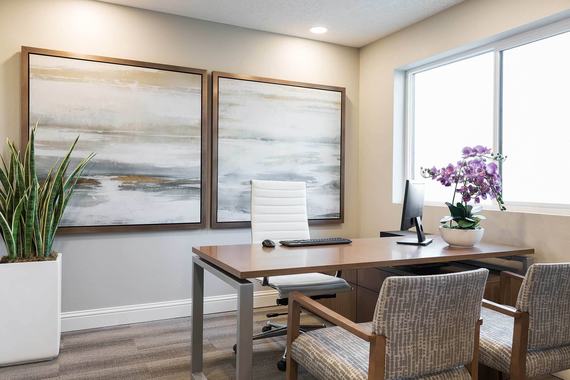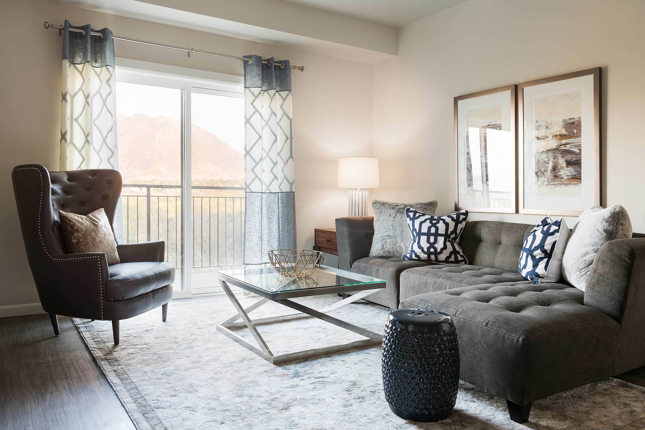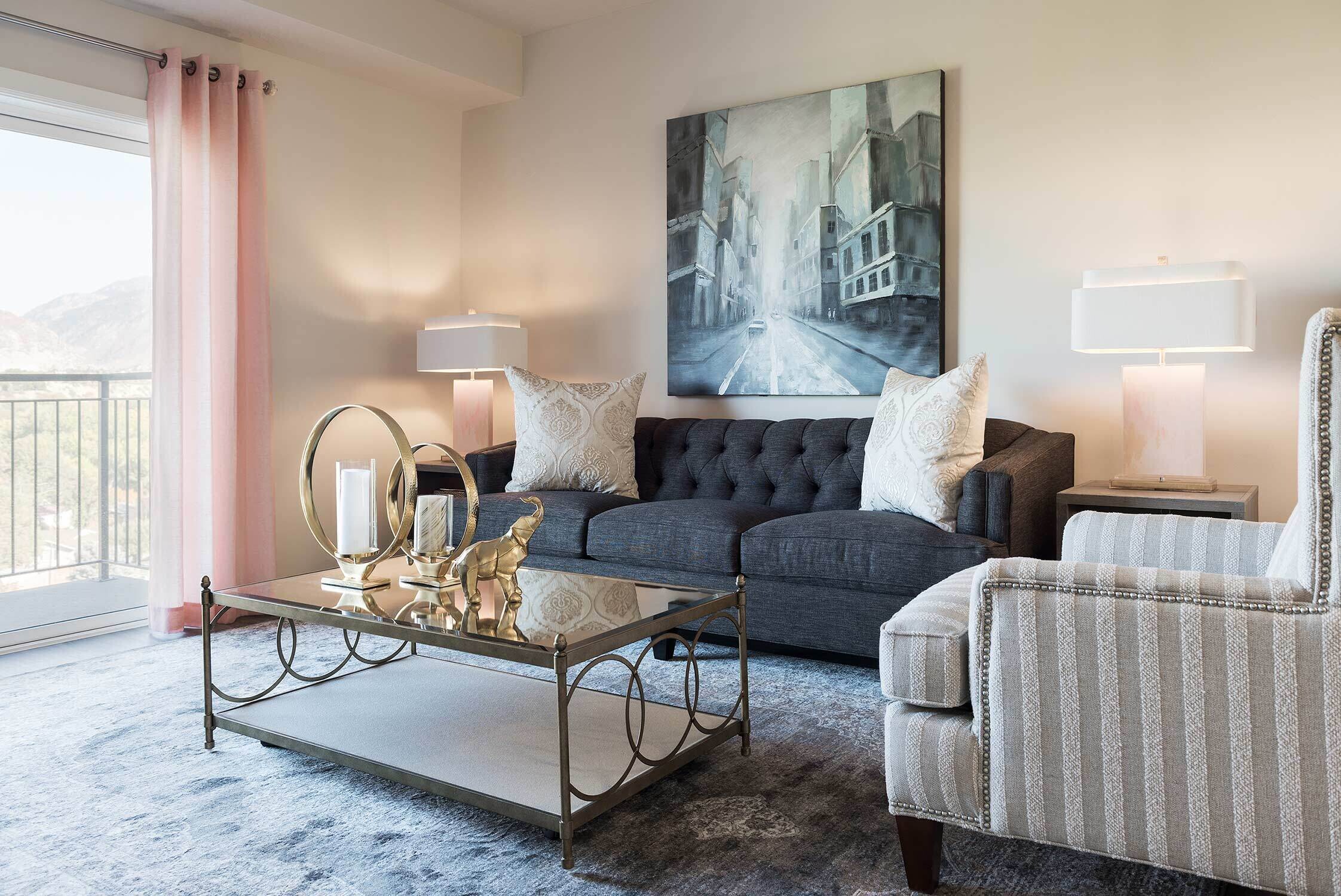 Tucked into a mountainous ridge in Sandy-Midvale, The Ridge multi-family apartment community is looking to create the convenience of urban life in a quiet getaway. Envisioning potential buyers, our multi-family design team adopted the mentality of a young trendsetter, incorporating a blush palate against clean patterns, natural stones, and florals to create a bold, feminine look.